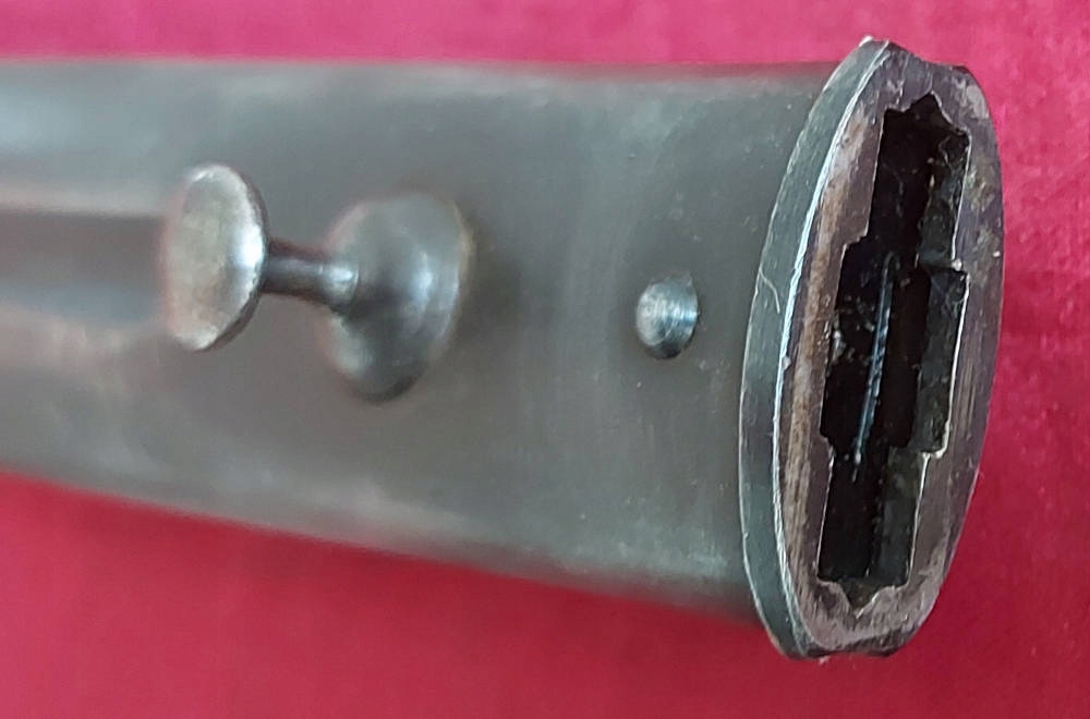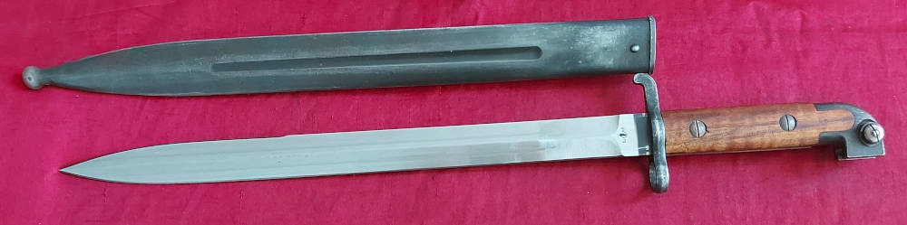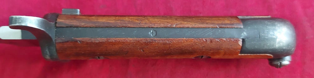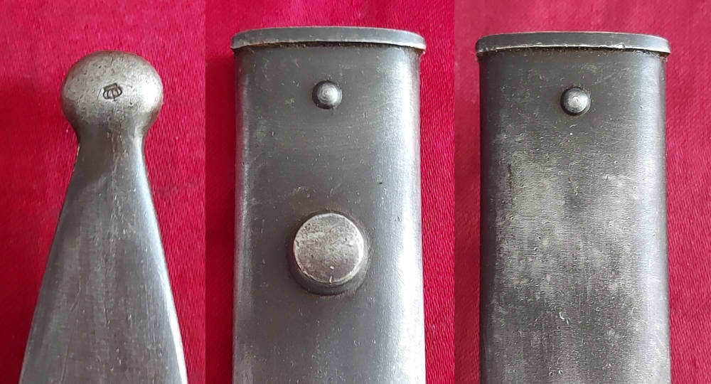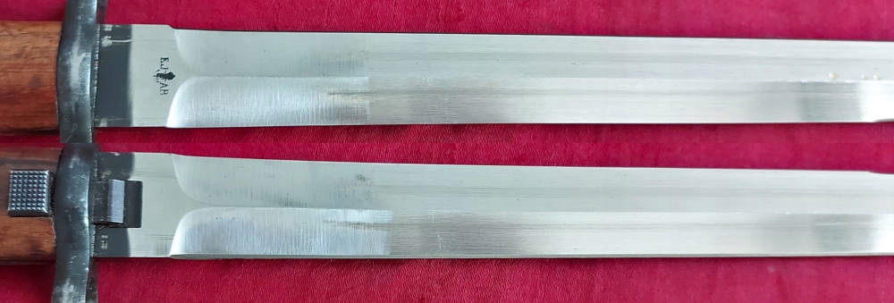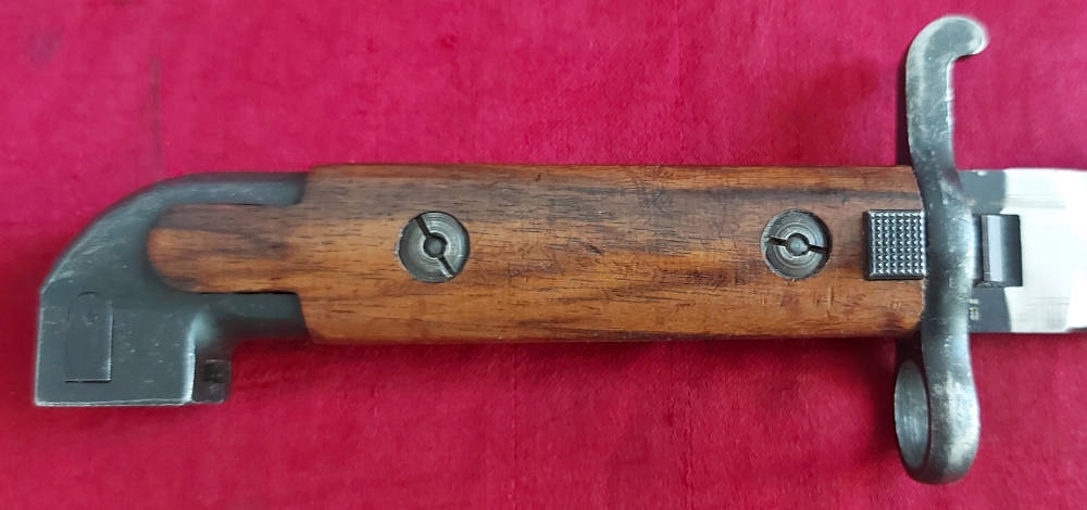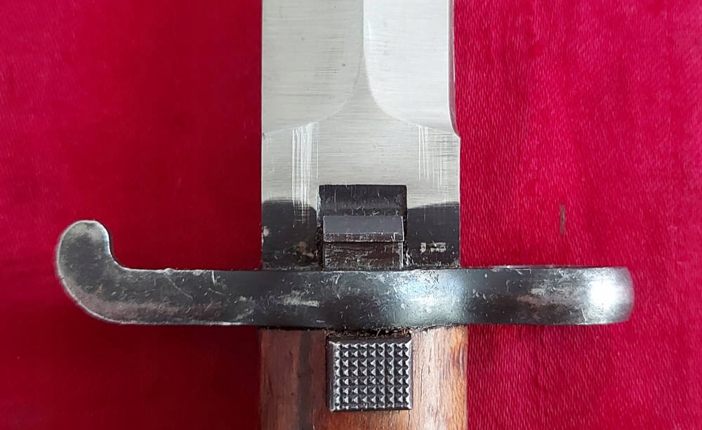 Товар, який видно на фото, дуже добре зберігся. Клинок у відмінному стані, тільки заводська заточка. На краю леза є маркування. Накладки на ручки дерев'яні, оригінальні. Багнетний замок працює.