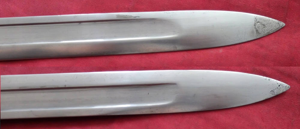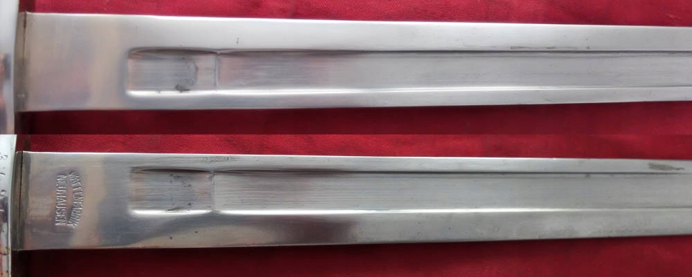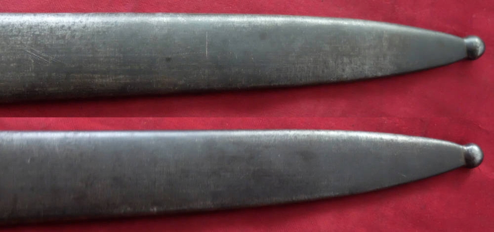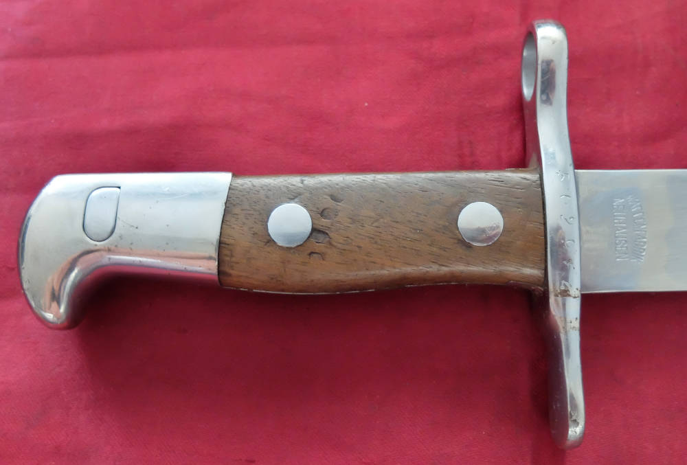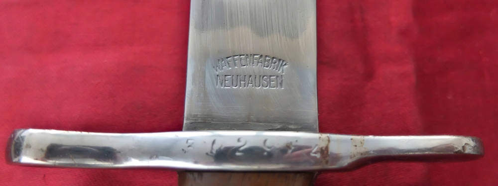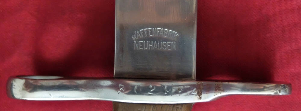 Екземпляр, який видно на фото, дуже добре зберігся. Лезо невідточене, незаточене, лише незначна корозія на лезі. На краю леза є маркування WAFFENFABRIK NEUHAUSEN. Накладки на ручки дерев'яні, оригінальні. Багнетний замок справний. На хрестовині вибитий номер 3029.4, він трохи розмитий.