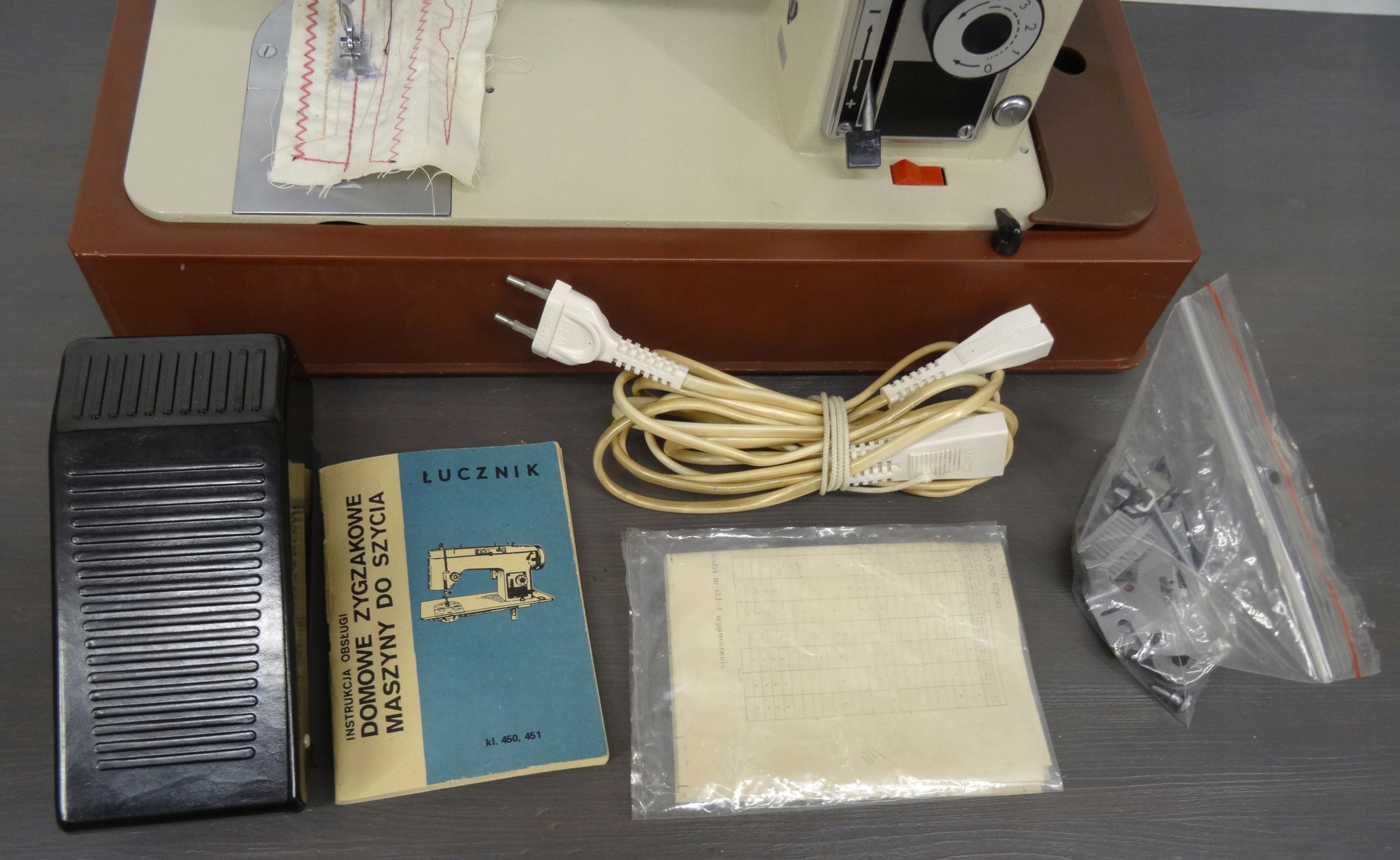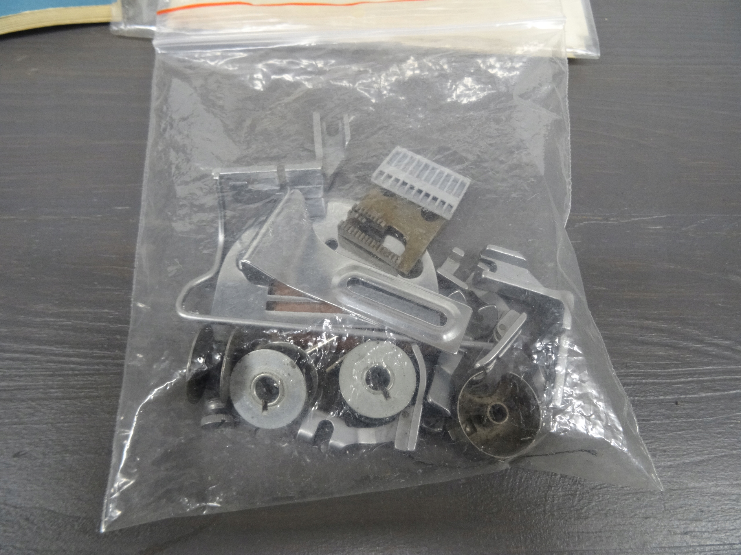валізу для швейного лучника 451Z 1988. У встановленій педалі, кабелі, інструкціях, гарантії 1988 року, різних частин - ніг, барабани тощо