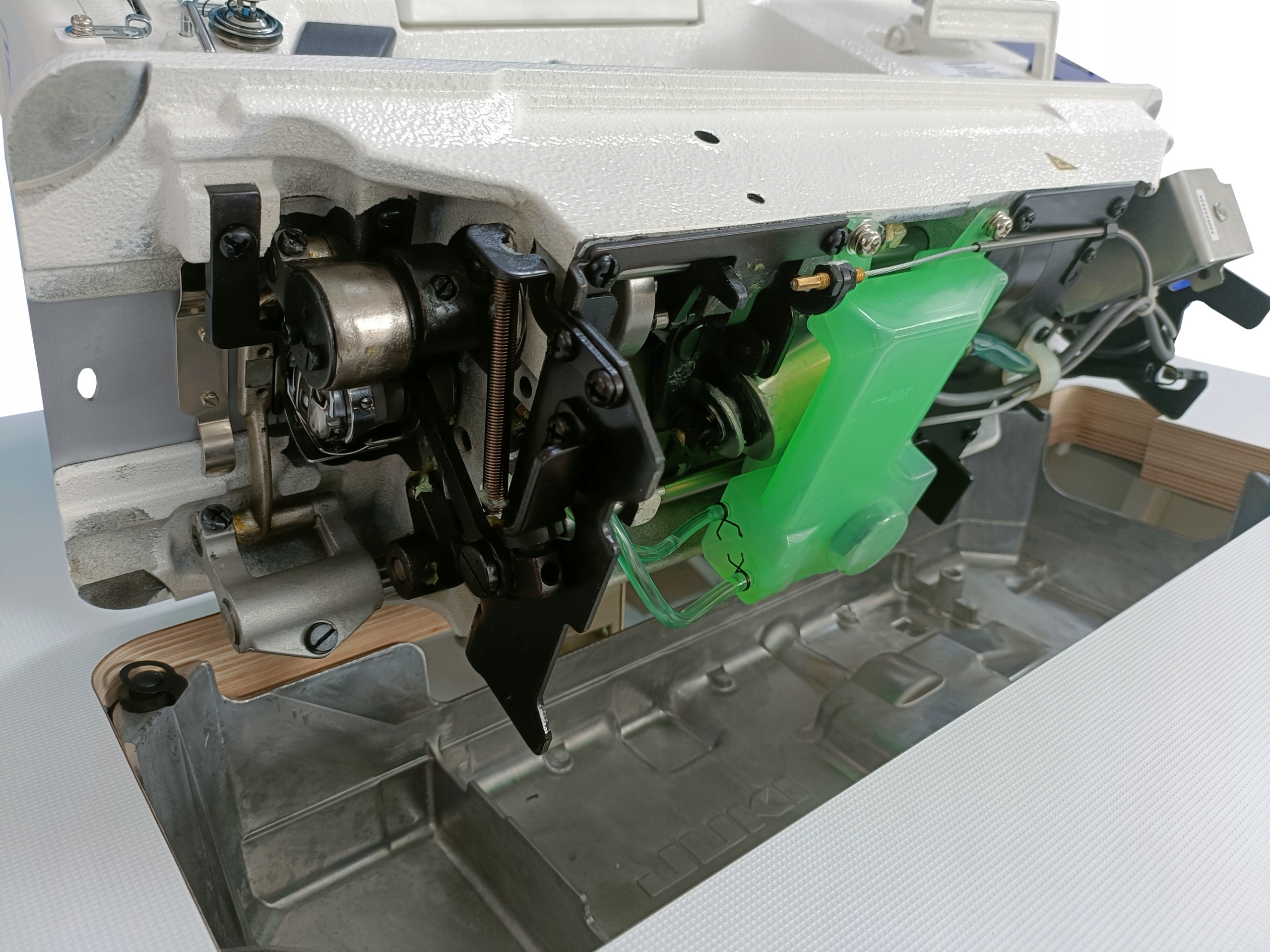 ◾ Швейна машина має енергетичний сервоочисник змінного струму, вбудований у голову (система прямого приводу) , яка забезпечує спокійну та надійну роботу, а його сучасний дизайн дозволяє покращити вентиляцію двигуна, перекладаючи на довший термін експлуатації машини. Покращене будівництво транспортної системи та матеріального тиску, що забезпечує більший діапазон товщини пришитного матеріалу.
