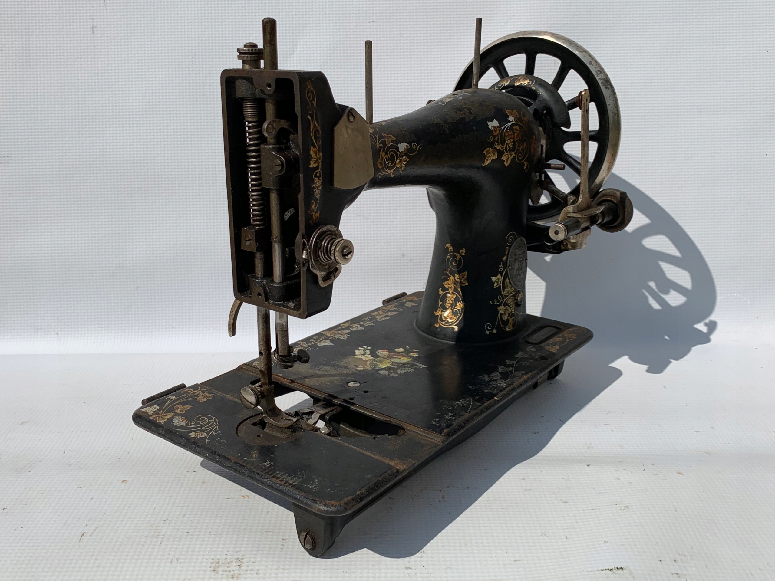 Предметом продажу є стара швейна машинка човник WINSRLMANN. На табличці написи WINSELMANN NAHMASCHINE DEUTSCHE INDUSTRIE. Дуже гарний візерунок з наклейкою з квітковим мотивом і птахами. Машина виглядає справною - колесо обертається, голка працює. Відсутні частини, як показано на фотографіях. Якщо ви шукаєте щось оригінальне, цей аукціон саме для вас.