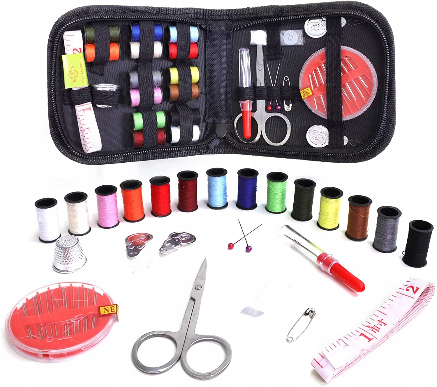 Повністю укомплектований - набір включає найважливіші швейні аксесуари: голки різних розмірів + органайзер для голок, ножиці, сантиметри, 14 ниток різних кольорів, наперсток, розділювач для швів, шпильки, 3 ґудзики, шпильки та нитка. Все це упаковано в красивий чохол.