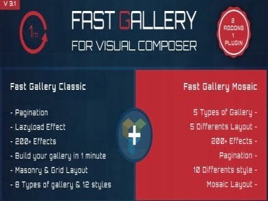 Дозволяє швидко створити галерею у Visual Composer. Fast Gallery для Visual Composer — це плагін Wordpress, який розповсюджує Codecanyon. Швидка галерея для Visual Composer дозволяє створити галерею за 1 хвилину за допомогою Visual Composer. Плагін містить 2 додатки, Fast Gallery та Fast Gallery Mosaic.