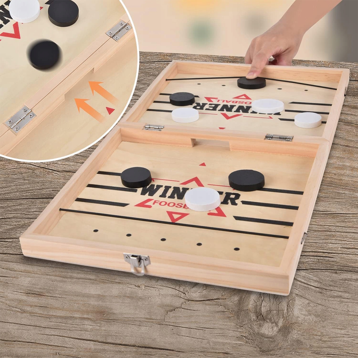 Портативний хокейний стіл 2 в 1 — це динамічна аркадна і стратегічна гра «все в одному». У цій настільній грі кожна сторона має п’ять гравців. Гравець використовує гумку, щоб викидати шайбу з дверей, доки шайби не залишиться. Перемагає той, хто першим очистить дошку.