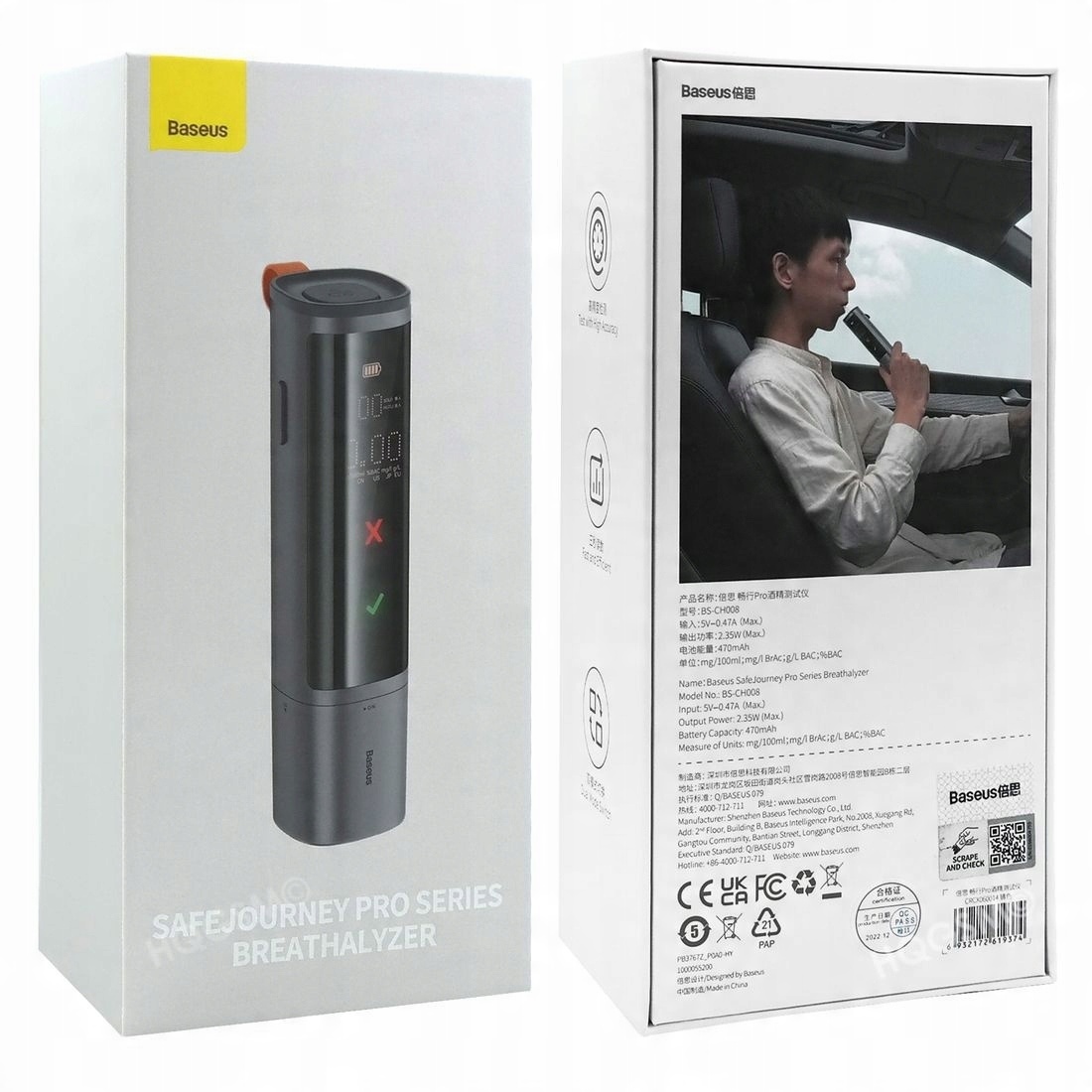 Невеликий цифровий алкотестер від Baseus для вимірювання концентрації алкоголю у видихуваному повітрі. Удосконалений електрохімічний датчик вимірює вміст алкоголю, і результат відображається протягом 3 секунд.