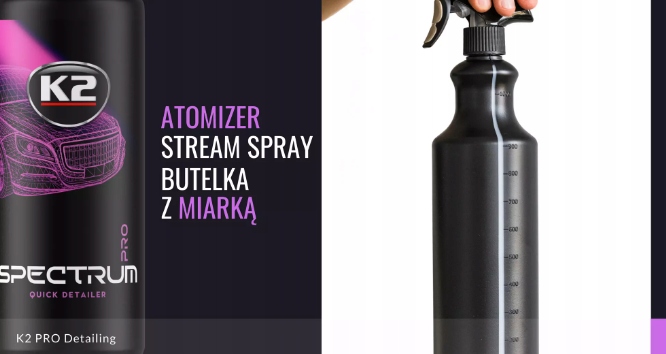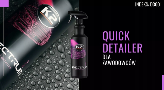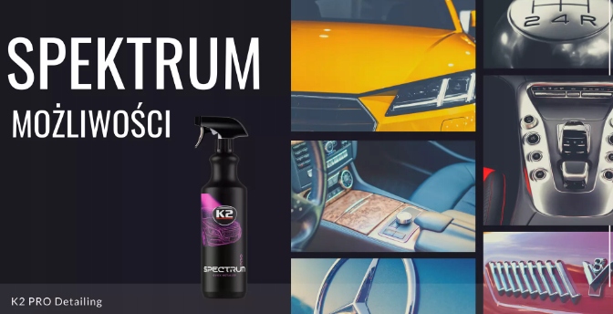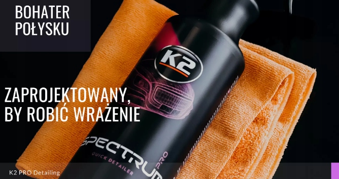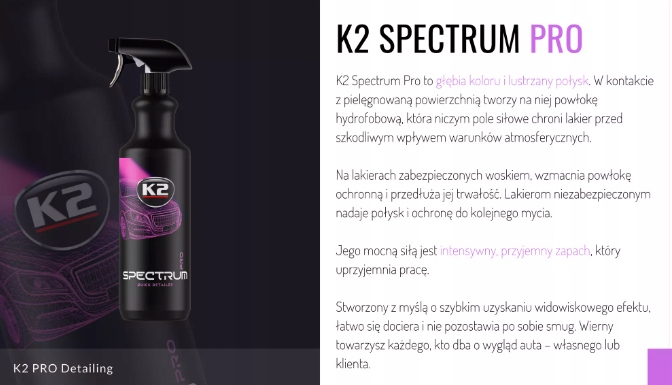 K2 SPECTRUM PRO — глянцевий герой на основі синтетичного воску. Швидкий деталізатор призначений для швидкого оновлення та блиску фарби та інших поверхонь. Пластмаса, гума, хромовані елементи – для нього ніщо не є проблемою. Миттєво ока він змінює їхній зовнішній вигляд і забезпечує привабливий вигляд для змагань.