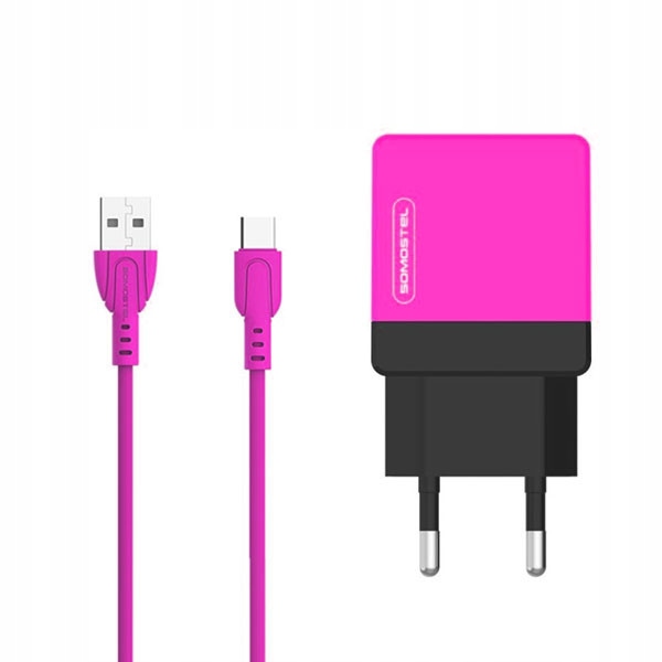 МЕРЕЖЕВИЙ ЗАРЯДНИЙ ПРИСТРІЙ 2A + КАБЕЛЬ TYPE-C РОЖЕВИЙ SOMOSTEL