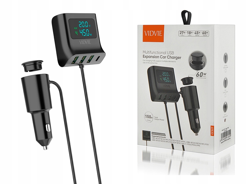 Автомобільний зарядний пристрій VIDVIE, 3xUSB + 1xType C 3xUSB 27W,18W,24W+1xType-C 45W
