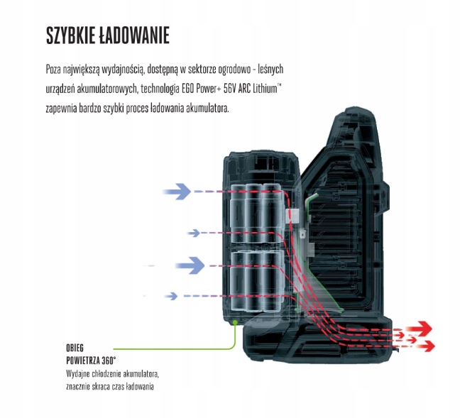 Від порожнього до повного заряджання всього за 30 хвилин. Наш швидкий зарядний пристрій може продовжити термін служби всіх наших професійних літій-іонних акумуляторів. Інтелектуальна система керування акумулятором постійно контролює потужність і температуру кожного елемента, щоб забезпечити найефективнішу та найшвидшу зарядку. Унікальна система зарядки, що охолоджується двома вентиляторами, дозволяє починати і закінчувати зарядку акумулятора раніше. Це означає, що час, необхідний для заправки батареї, часто менше, ніж час роботи, отриманий після повної зарядки. Корисний світлодіодний індикатор заряджання/діагностики показує хід заряджання та стан заряджання.