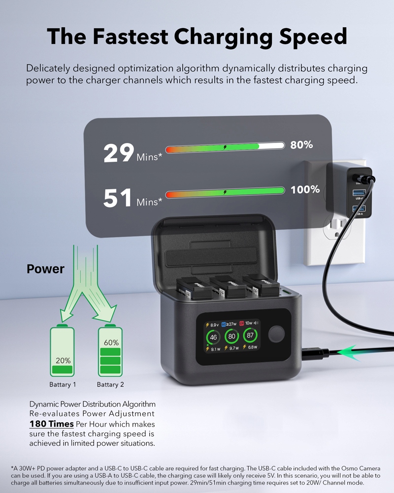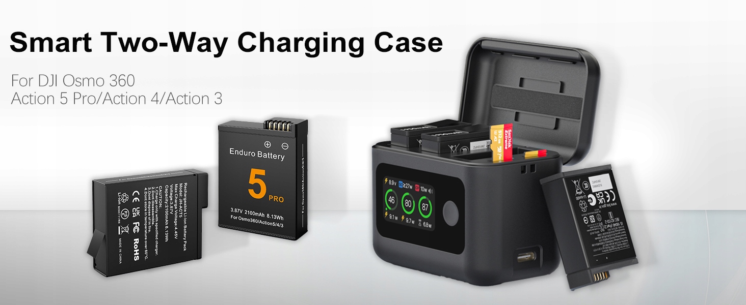 【Універсальний розумний чохол для швидкого заряджання】Цей 3-канальний чохол для швидкого заряджання DJI Osmo 360/Action 5 Pro/Action 4/Action 3 поєднує в собі джерело живлення, накопичувач, еквалайзер і чохол для зберігання акумулятора – 5 функцій в одному. Примітка: цей зарядний чохол може заряджати акумулятор потужністю до 20 Вт. Заводське налаштування за умовчанням становить 10 Вт/канал. Просто встановіть значення 20 Вт/канал (див. посібник користувача) у меню налаштувань.