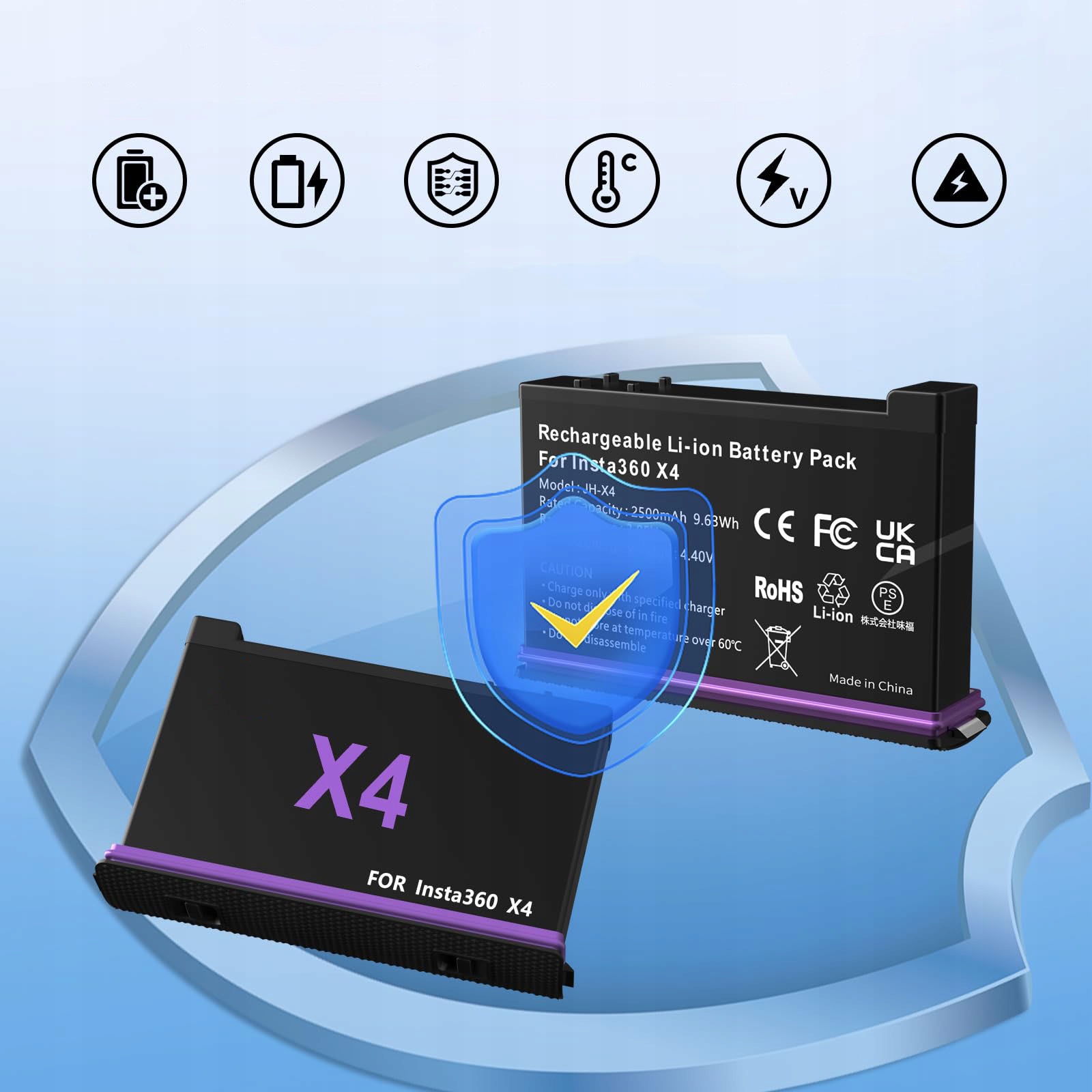 Високоякісний акумулятор insta360 x4 має вбудовані схеми захисту від перезаряду, перегріву, перевантаження по струму, перенапруги та короткого замикання, що ефективно запобігає потенційній небезпеці.