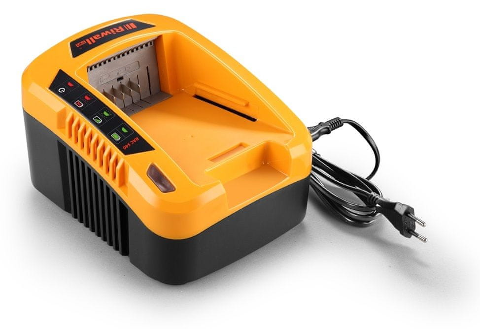 зарядний пристрій • підтримка швидкого заряджання • електронне керування керуванням заряджанням кожної клітинки • світлодіодний індикатор заряджання та стану • можна повісити на стіну • сумісний з акумуляторами Riwall 40 В • час заряджання 30 хв (2 Ah), 60 хв (4 Ah), 90 хв (6 Ah)