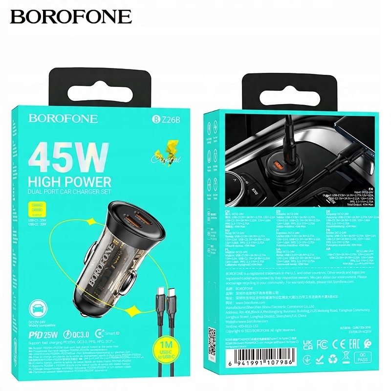 BOROFONE BZ26B Discovery є швидкий автомобільний зарядний пристрій із двома вихідними роз’ємами, один USB Type-C / Type C / Type C з максимальною потужністю 25 Вт, а другий роз’єм також USB-C з максимальною потужністю 20 Вт, підтримує стандарти швидкої зарядки, такі як QC3.0 / QC2.0 / Huawei FCP, Apple PD20W або Samsung AFC. У набір додатково входить кабель Power Delivery / PD з роз’ємом USB Type-C / Type C, довжиною 1 М / 100 СМ.