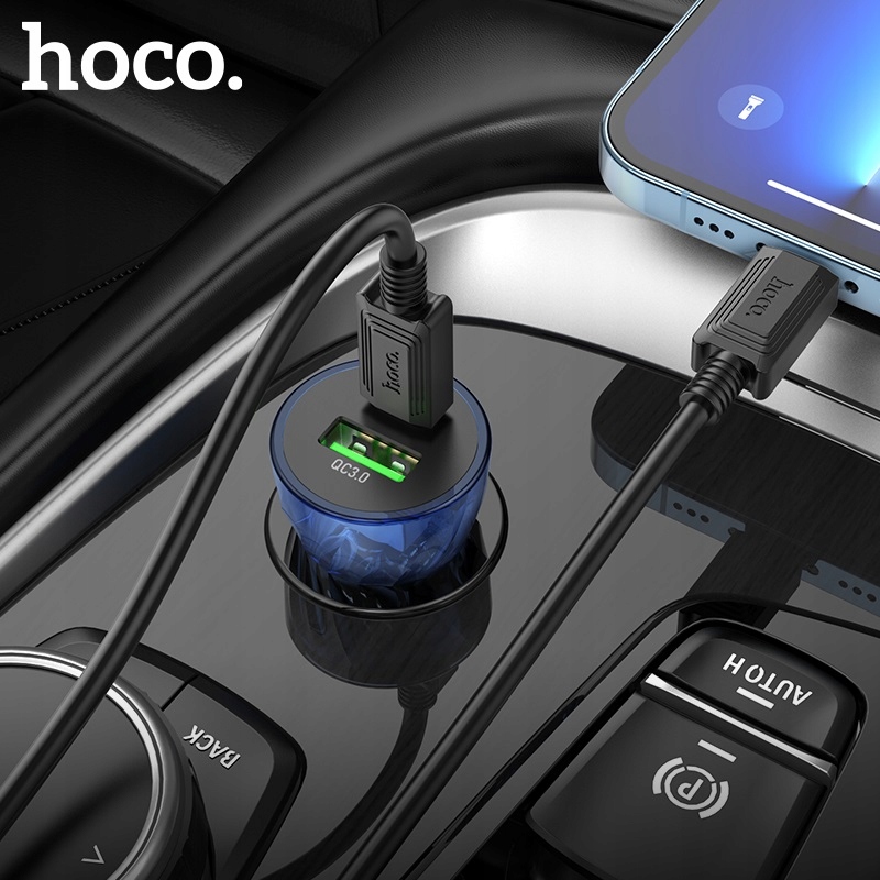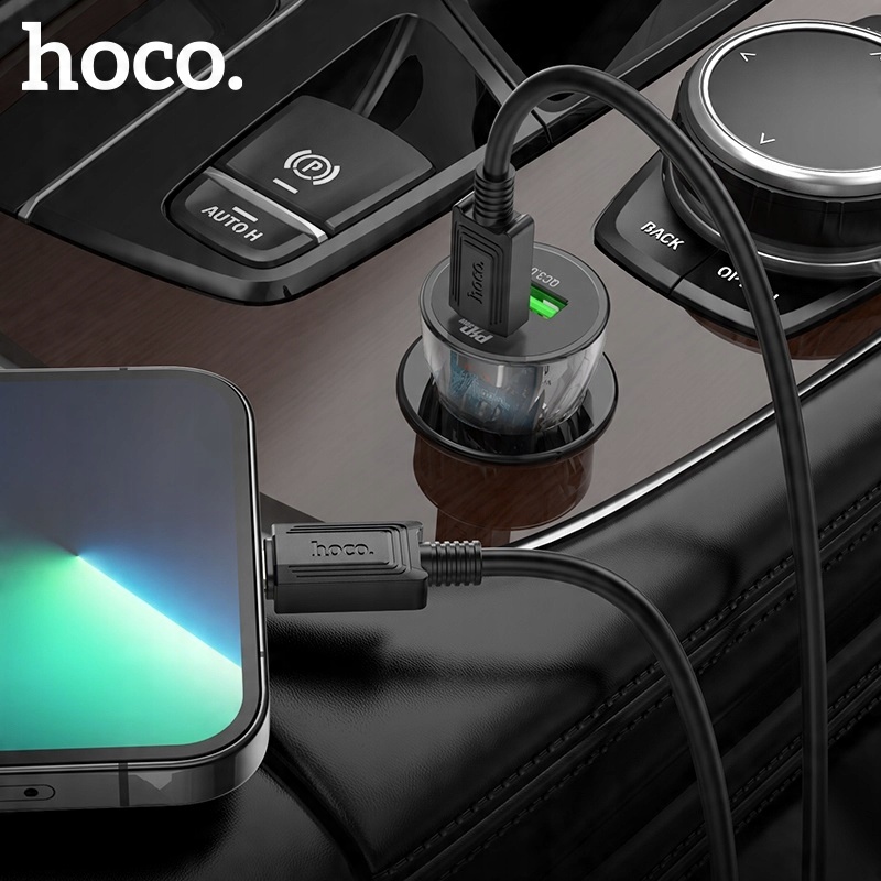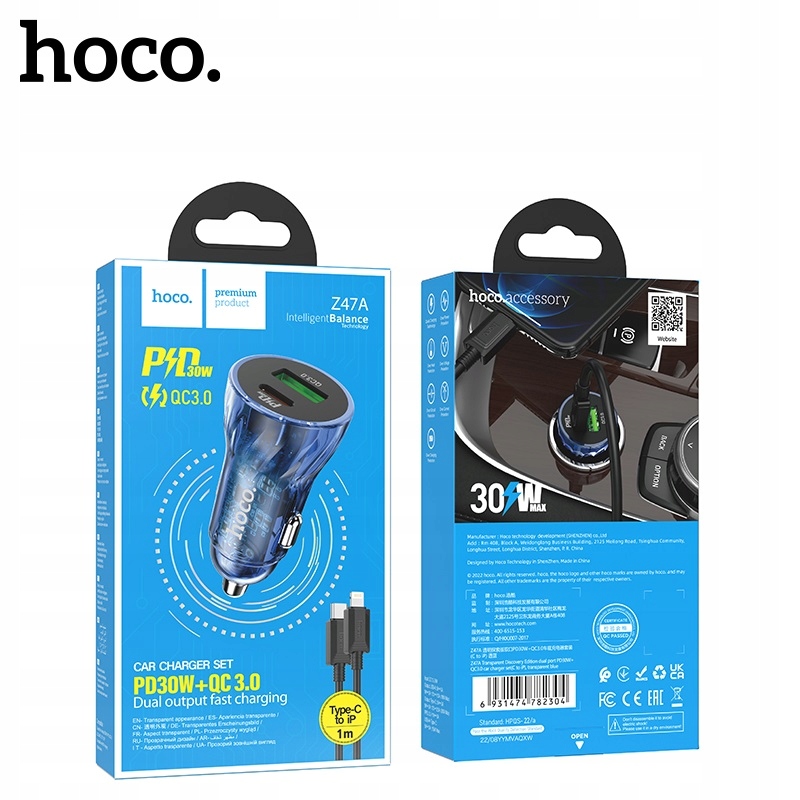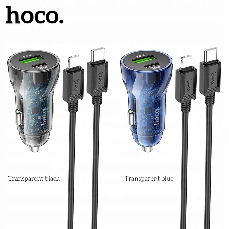 hoco Z47A Transparent Discovery Editionшвидкий автомобільний зарядний пристрій із двома вихідними роз’ємами, одним USB Type-C / Type C з максимальною потужністю 30 Вт і одним роз’ємом USB-A у стандарті Quick Charge 3.0 / QC3.0 з максимальною потужністю 18 Вт, підтримує стандарти швидкої зарядки, такі як QC3.0 / QC2.0 / Huawei FCP, Apple PD20W або Samsung AFC. У набір додатково входить кабель з роз'ємом USB Type-C / Type C to Lightning довжиною 1 М / 100 СМ.