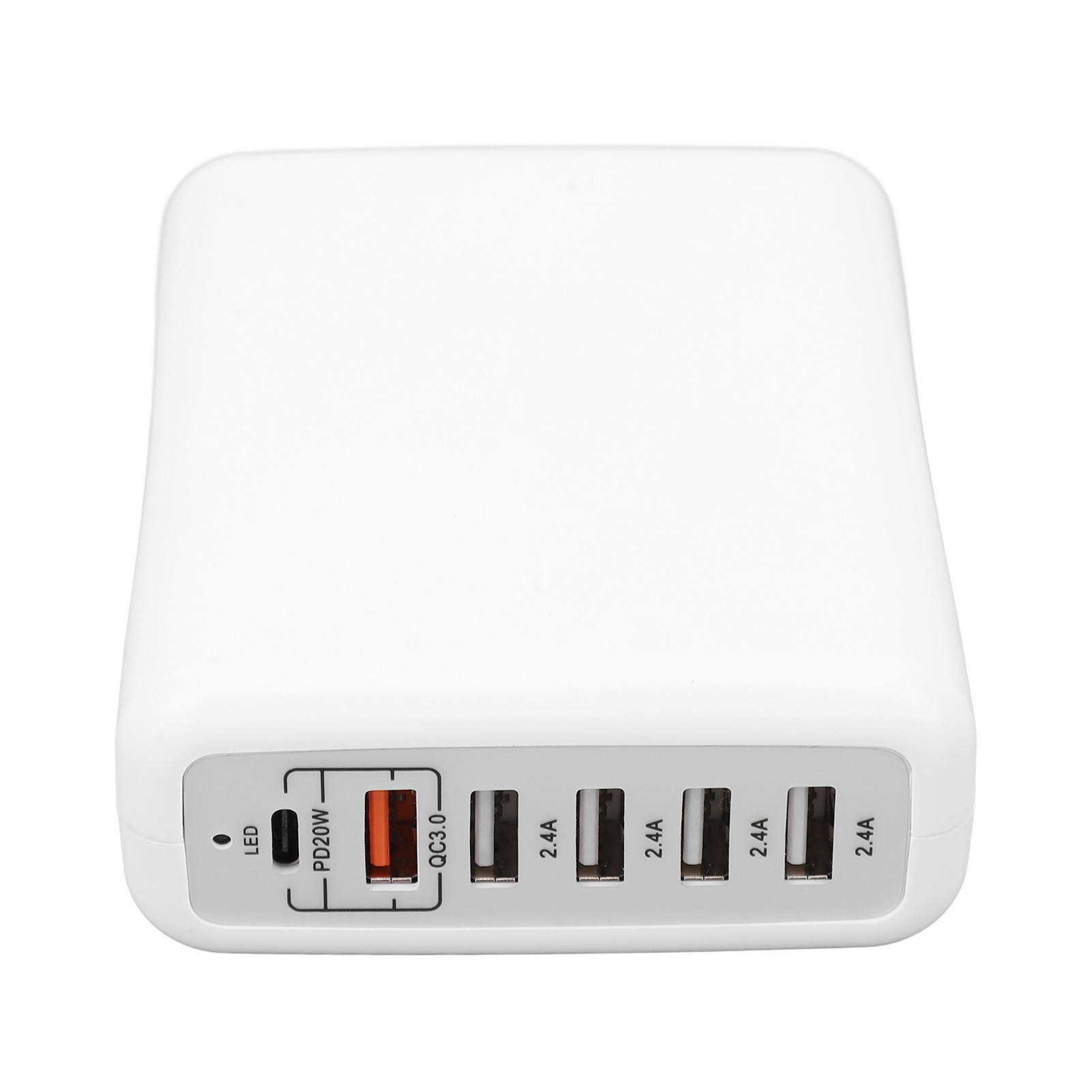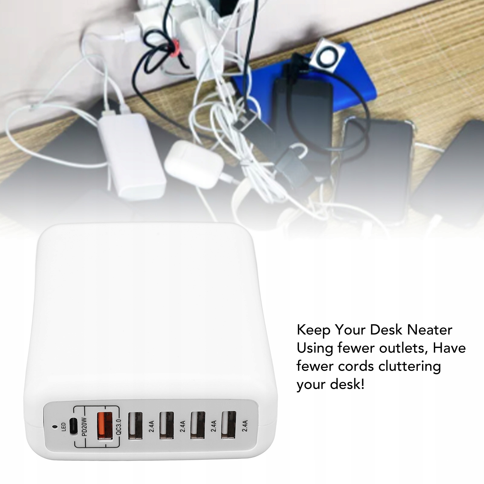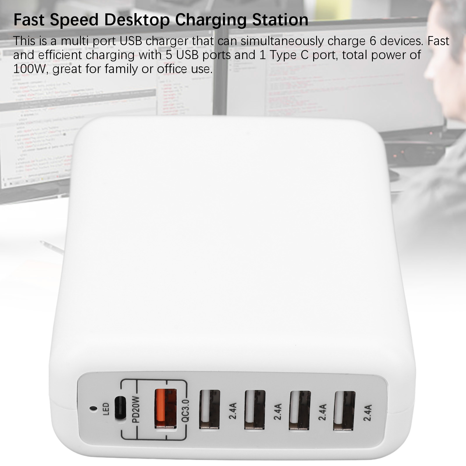 1. Станція швидкої зарядки для настільного комп’ютера: це багатопортовий USB-зарядний пристрій, який може заряджати 6 пристроїв одночасно. Швидке й ефективне заряджання завдяки 5 портам USB і 1 порту типу C, загальною потужністю 100 Вт, ідеально підходить для сімейного чи офісного використання.