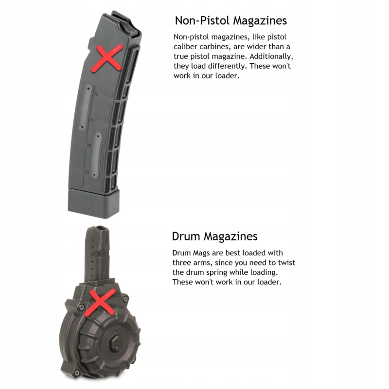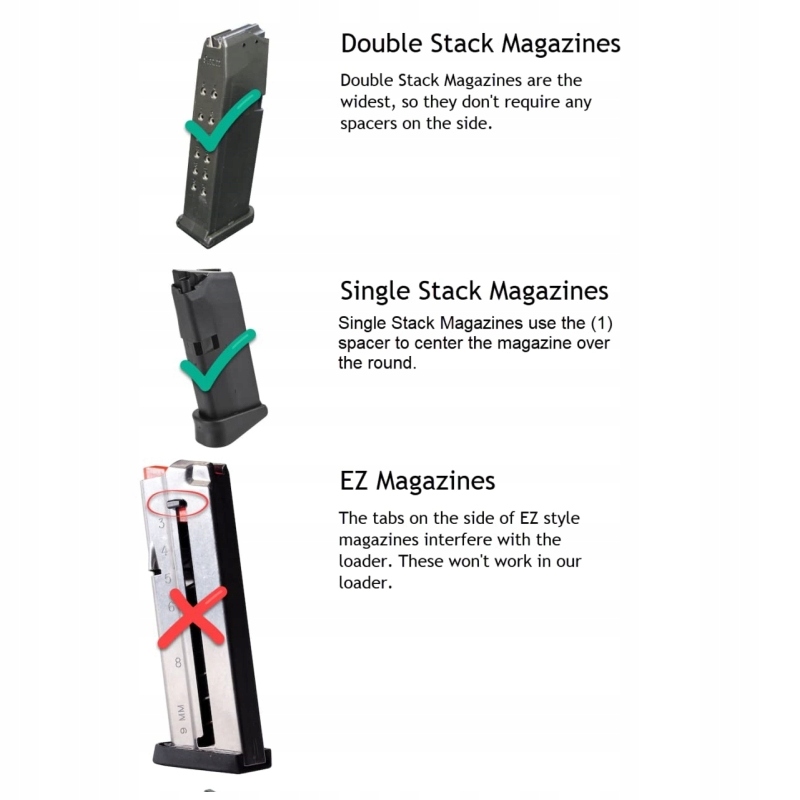 - Можливість адаптуватись до різних калібрів:Заряджальник можна адаптувати до боєприпасів калібру 9MM та .40S&W, що відповідає потребам різних