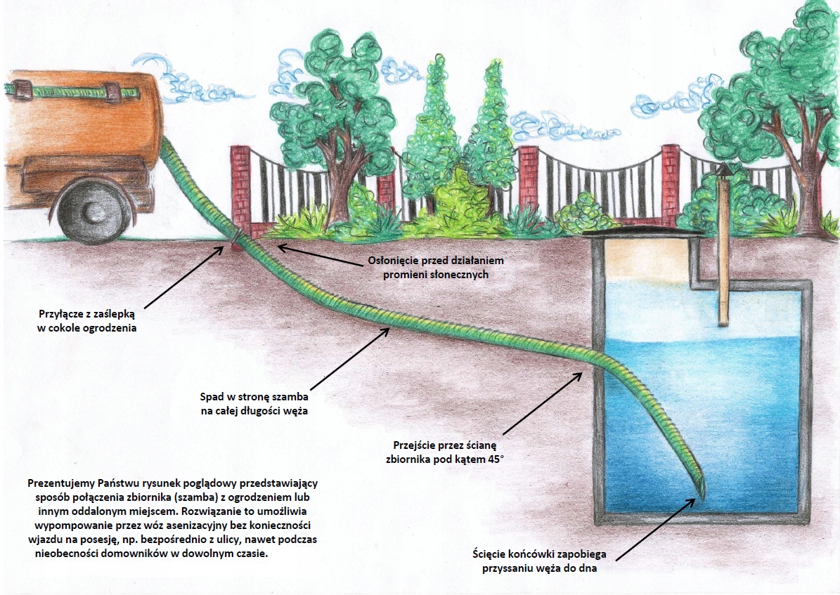 Підключення - всмоктувальний шланг з роз'ємом STORZ і кришкою, загальна довжина 110 см, призначений для розширення входу в септик, щоб під'єднати шланг водоцистерни без необхідність увійти на територію.