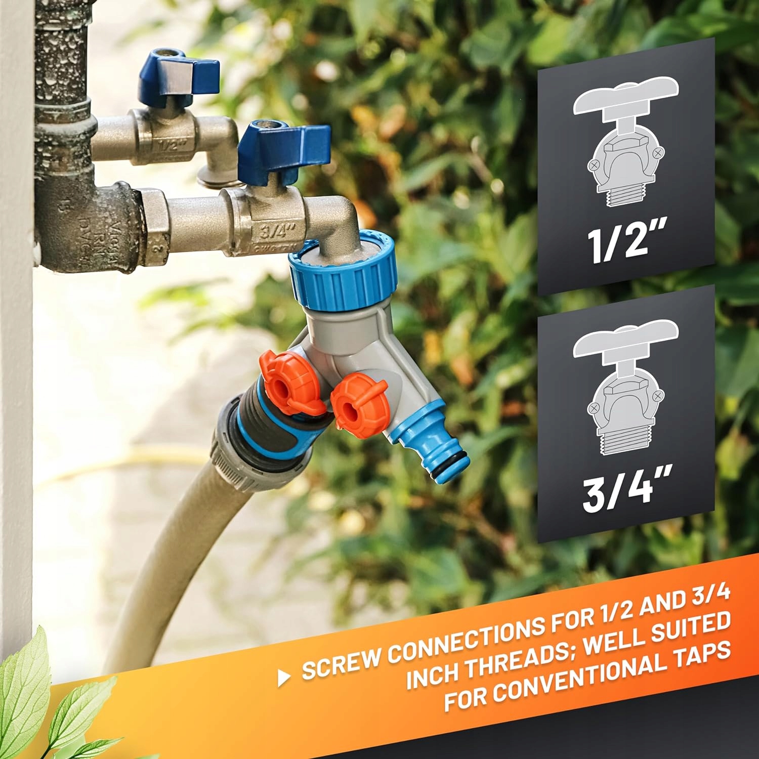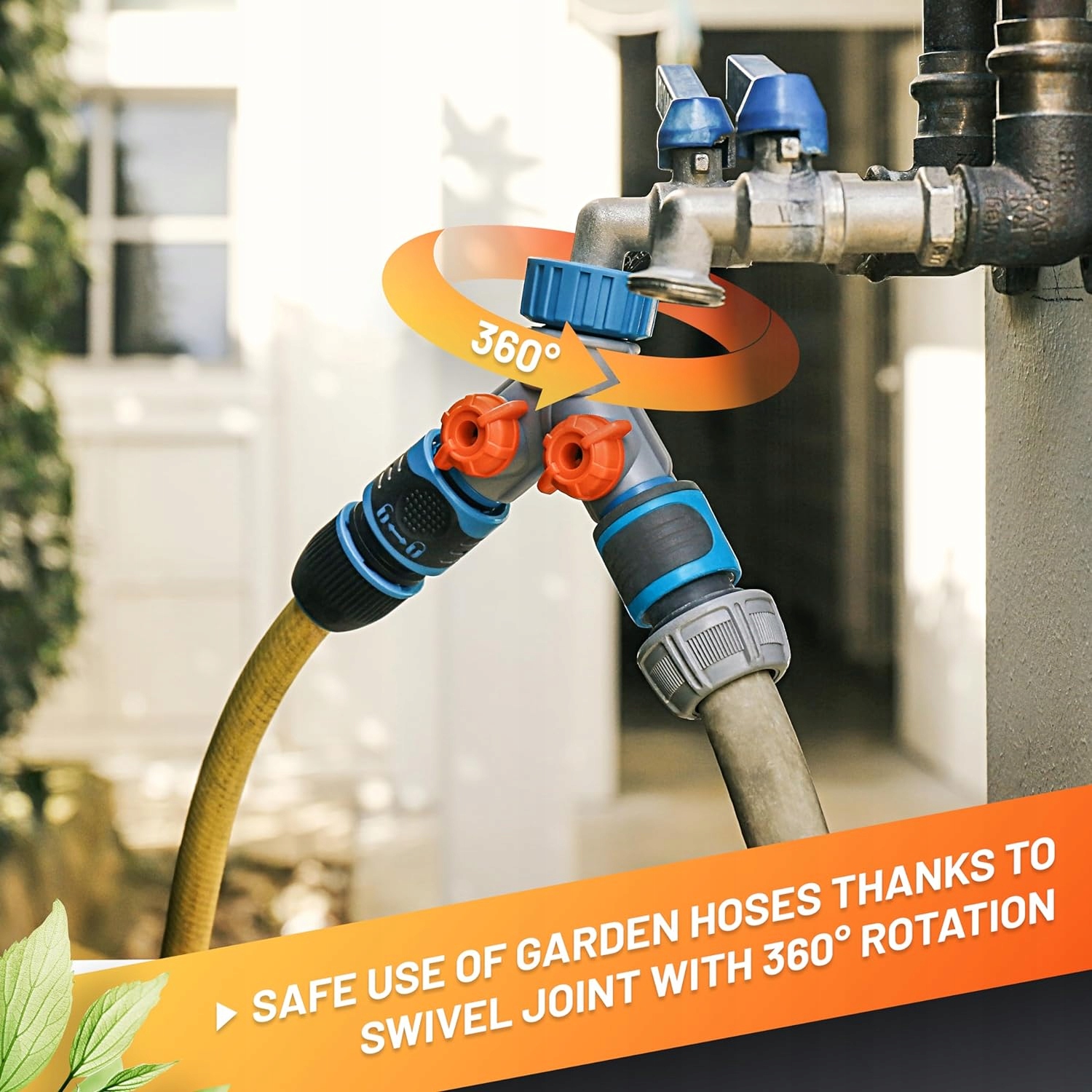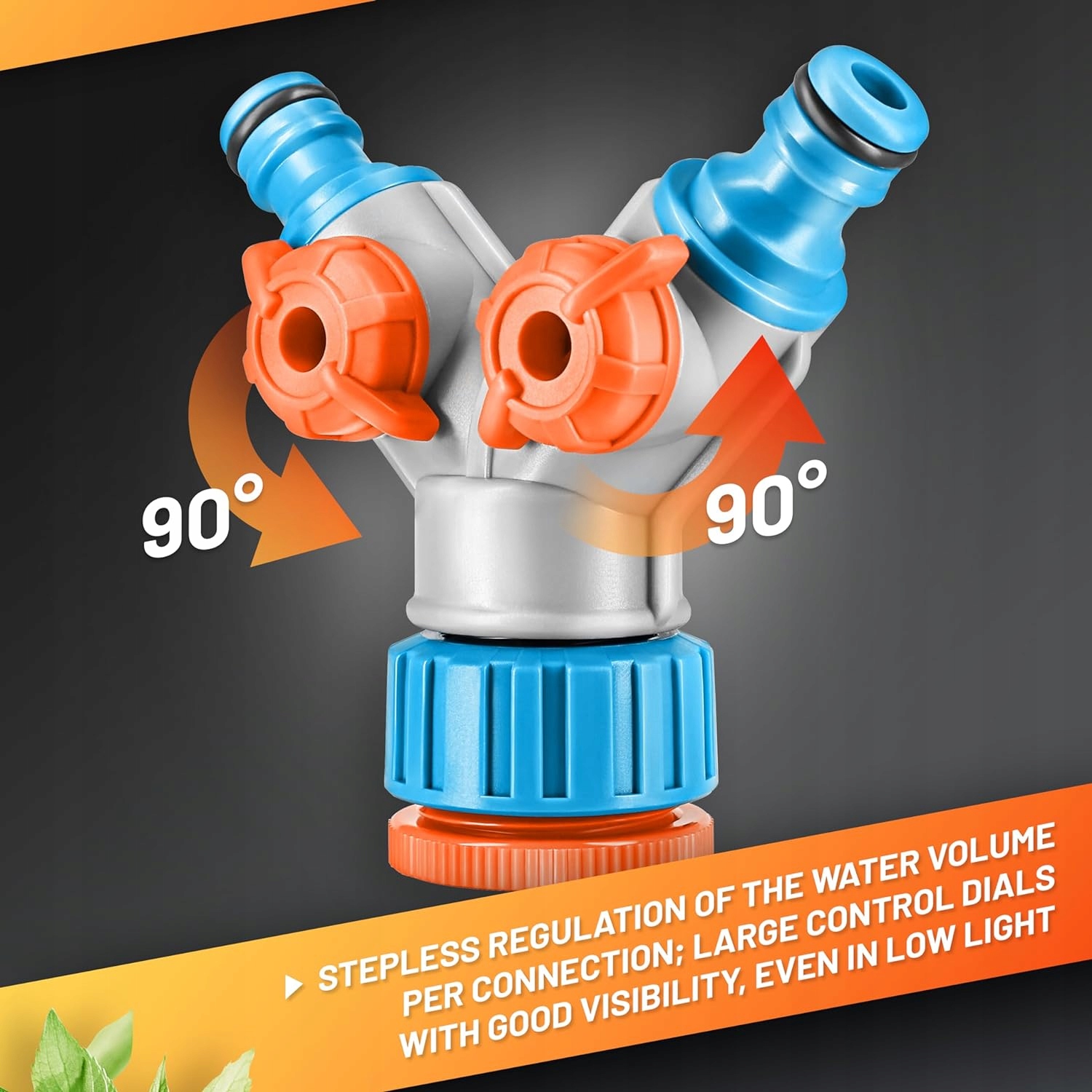 - Збільште вдвічі можливості підключення садових шлангів, зрошувальних пристроїв, адаптерів для очищення та багатьох інших інструментів для поливу та прибирання саду