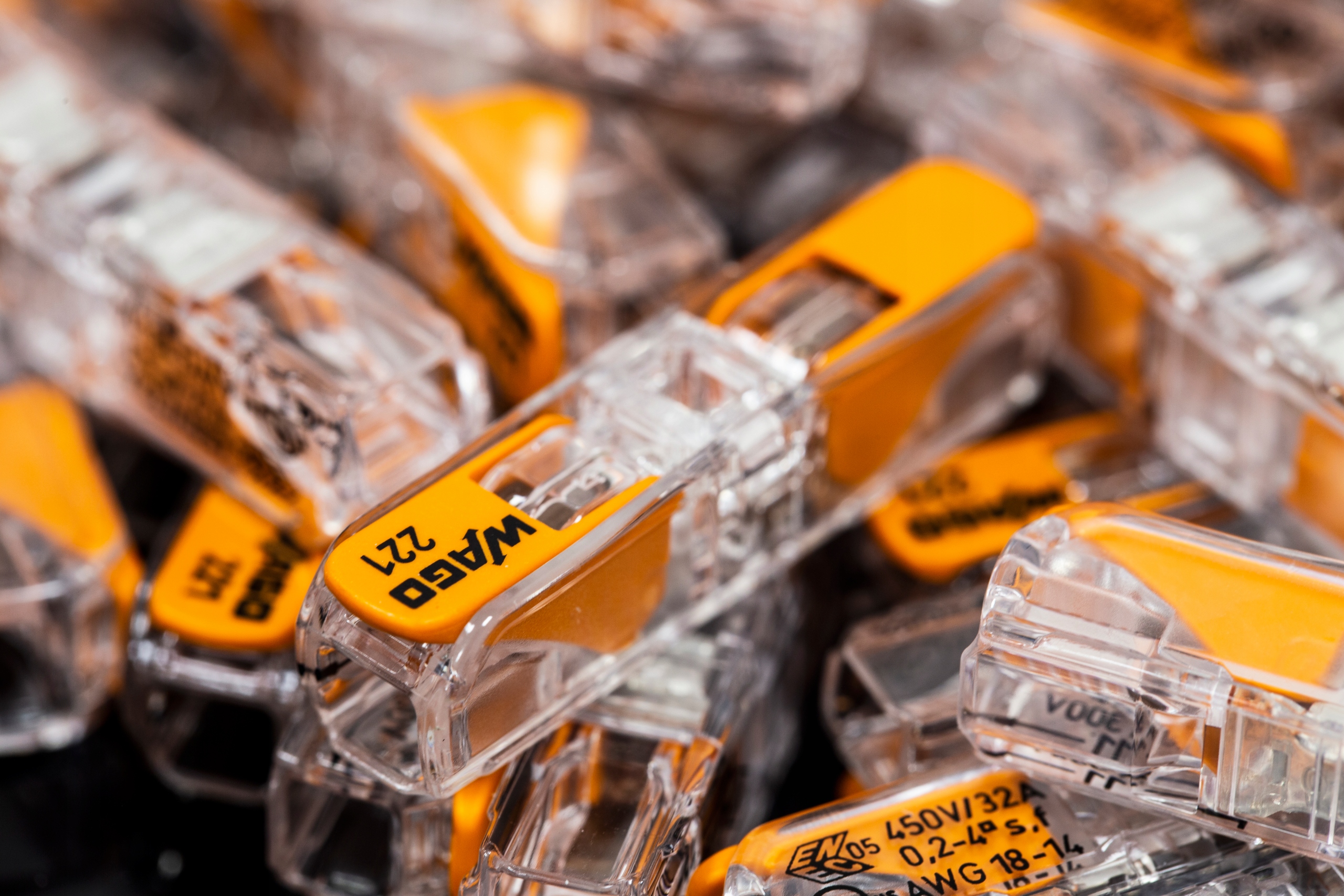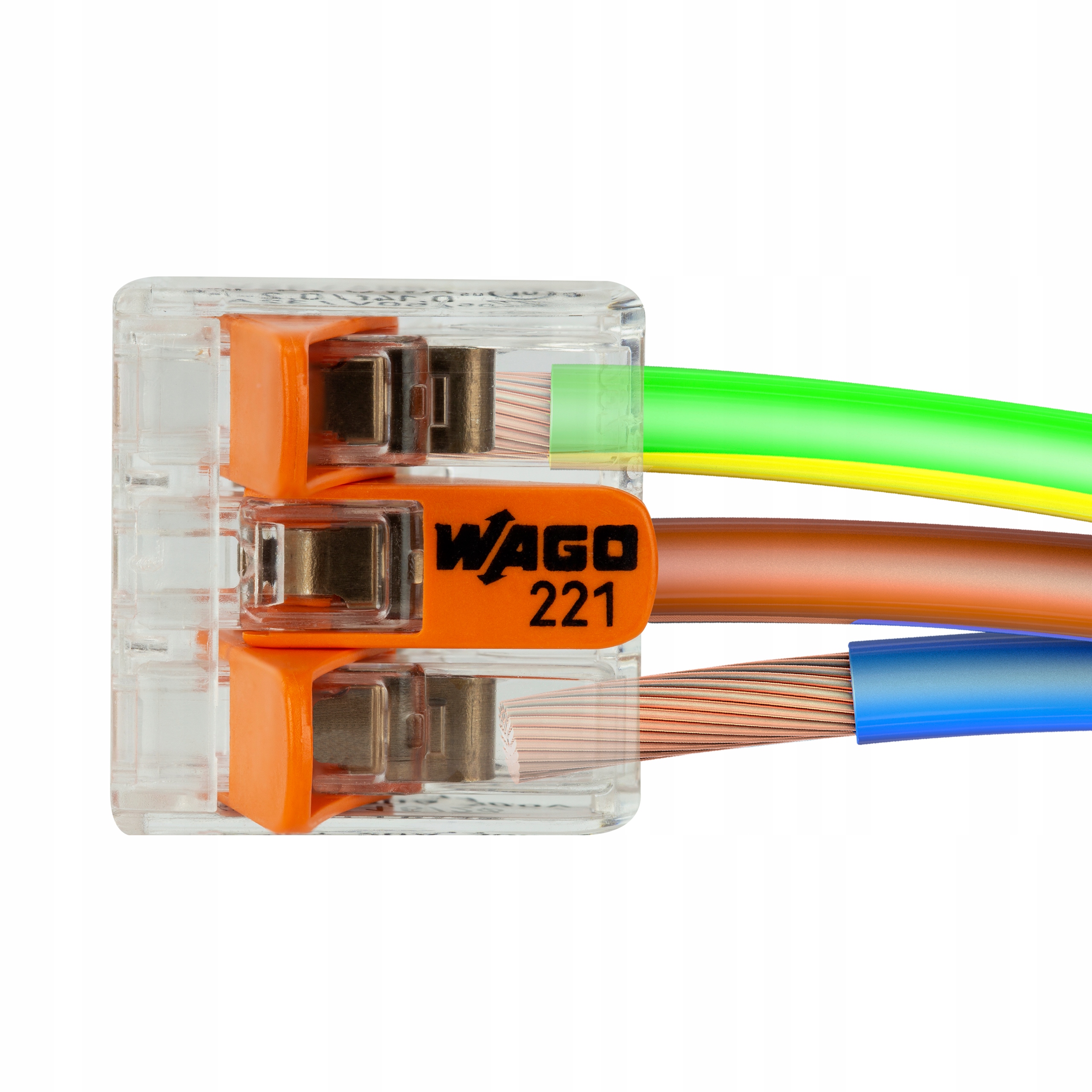 Швидкоз'єднувач універсальний монтажний WAGO, серія 221, оснащений затискачем CAGE CLAMP, призначеним для з’єднання одножильних кабелів (так званий дріт) і багатожильних кабелів (так званий жила).