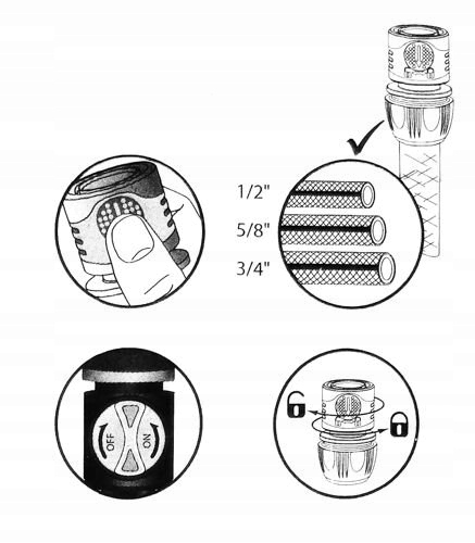 - БЕЗПЕЧНА система «turn-click», що забезпечує надійне кріплення інструменту. Після підключення швидкого роз’єму до спринклера або іншого пристрою просто поверніть головку швидкий роз’єм для фіксації роз’єднання.