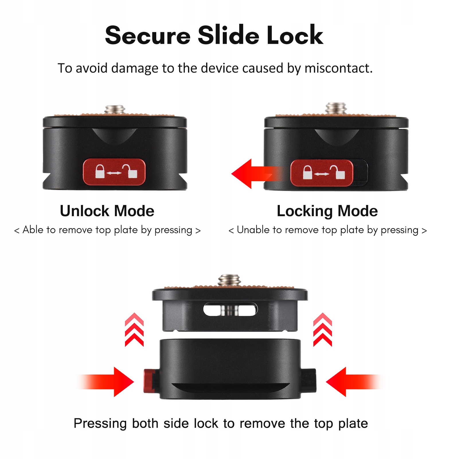 - 【Дизайн бічного замка】 Інноваційна конструкція бічного замка дозволяє використовувати верхню частину. пластина знімається швидко й легко, тож ви можете зняти її чи прикріпити камеру простим натисканням на замки.
