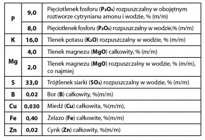 Склад: PK (MgS) 9-16(4-33) з бором (B), міддю (Cu), залізом (Fe) і цинком (Zn)