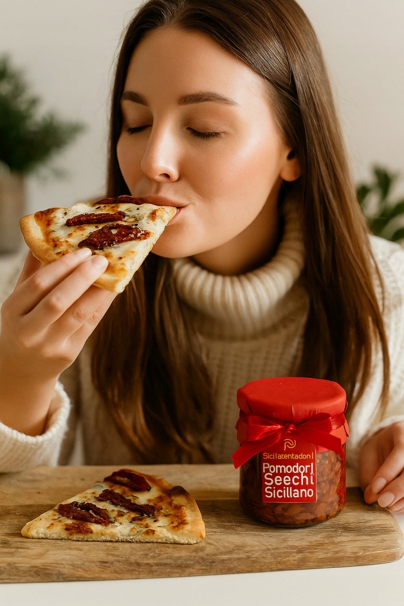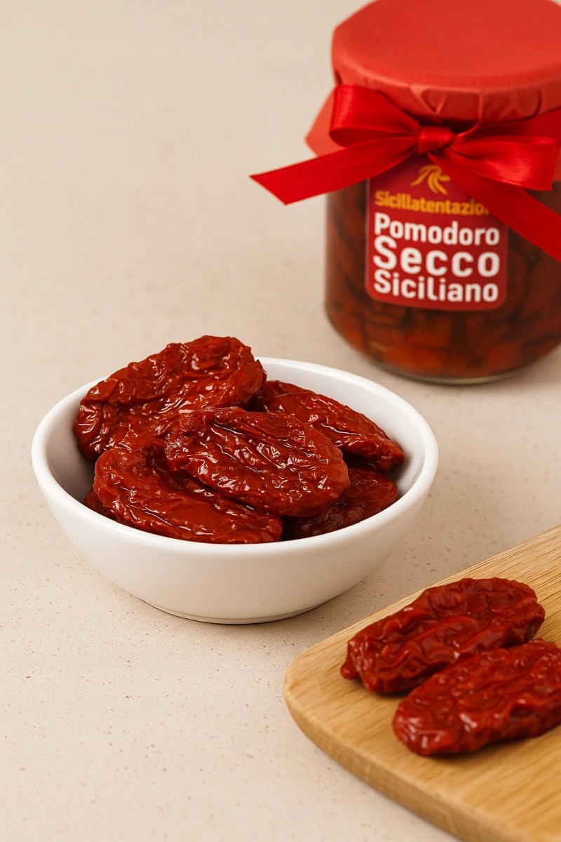 Sicilia Tentazioni співпрацює з місцевими фермерами та виробниками, використовуючи переваги багатства сицилійської землі: солодкі помідори, що дозрівають на сонці, ароматні трави, оливкова олія та натуральні добавки. В’ялені помідори – один із найбільш впізнаваних продуктів регіону, а у виданні Sicilia Tentazioni вони стають справжнім делікатесом – вишукані до деталей, створені невеликими партіями, з увагою до кожного етапу виробництва.