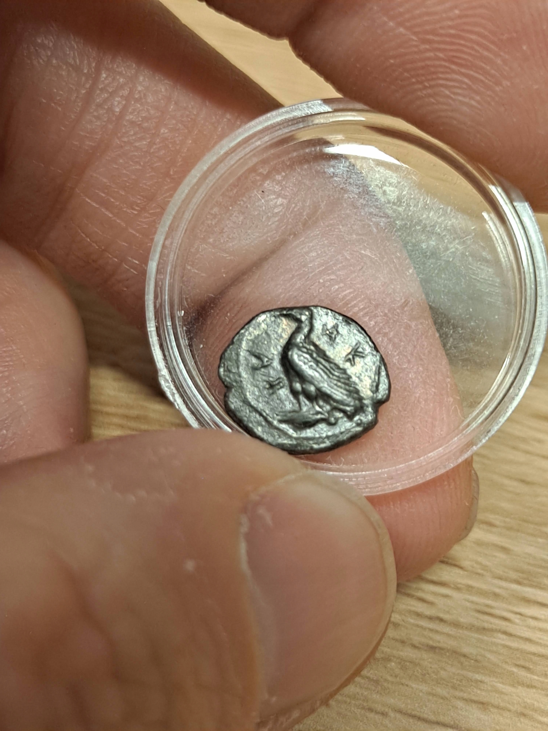 Аверс: AKPA, орел обличчям ліворуч, стоїть на капітелі іонічного типу.