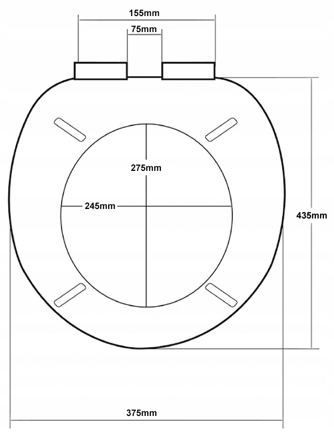 - Регульована відстань між монтажними гвинтами від 75 мм до 155 мм (вимірювання слід проводити від центру одного отвору до центру іншого в унітазі)