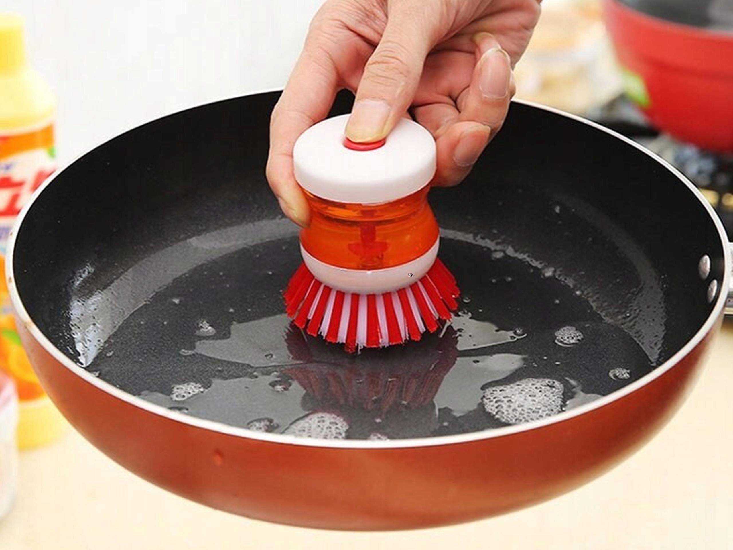 Універсальна практична щітка для домашнього використання з дозатором миючих засобів, наприклад рідини для миття посуду. Рідина виділяється, коли ви натискаєте кнопку у верхній частині щітки.