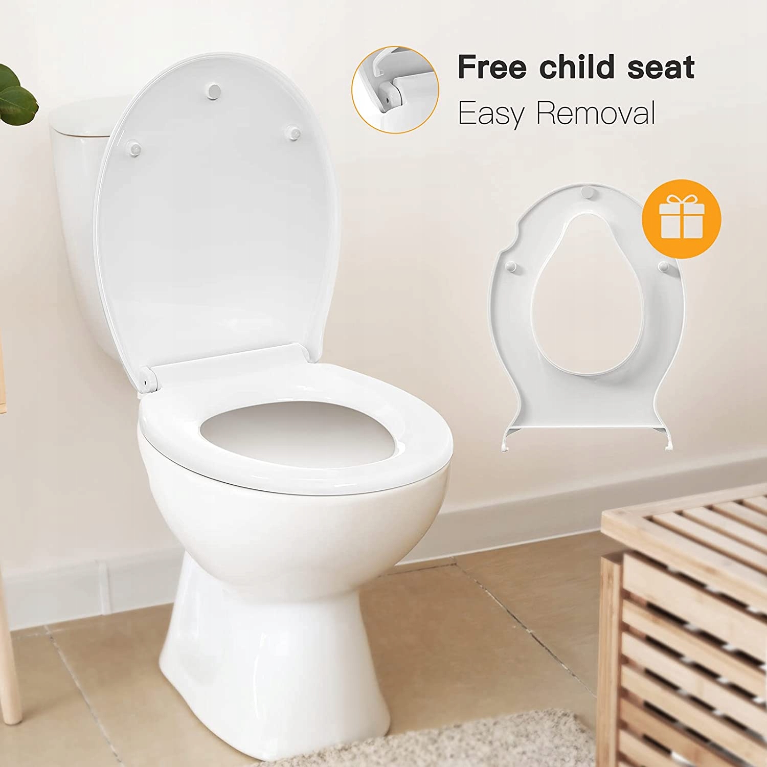 - Практичне сімейне сидіння. Наша кришка для унітазу складається з двох кришок для унітазу, одна для дорослих, а інша вбудована для дітей. Спеціальна магнітна конструкція робить дитячі окуляри такими практичними, що тримаються на кришці унітазу, і їх можна зняти з магнітного з’єднання, коли вони не використовуються. дозволяє однією рукою повільно та безшумно закриватися, щоб уникнути ризику розчавлення маленькими дітьми завдяки механізму м’якого закривання