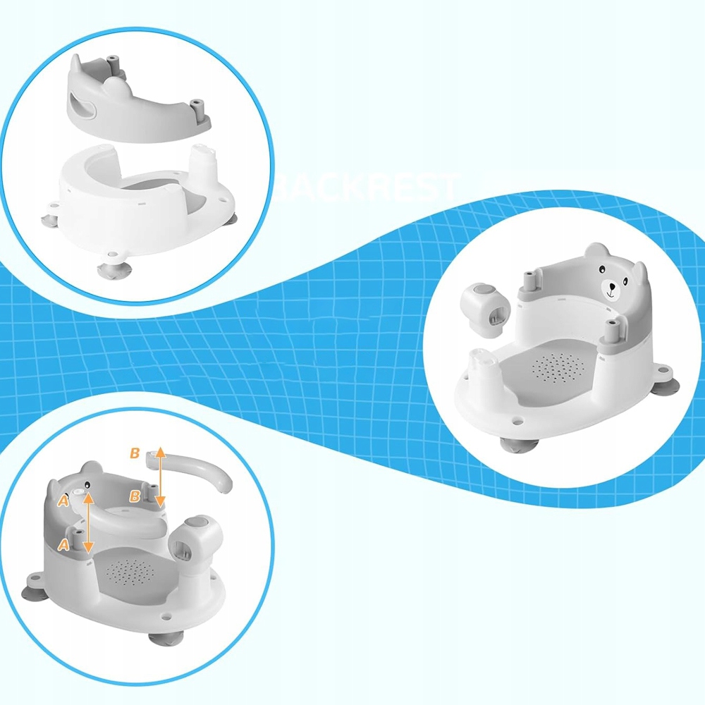 виготовлені з високоякісних матеріалів PP + TPR, спеціально розроблені для немовлят віком від 6 місяців; Він має суцільну спинку та чотири несувні присосні чашки біля основи, які забезпечують безпечну та зручну ванну, покращуючи комфорт купання.