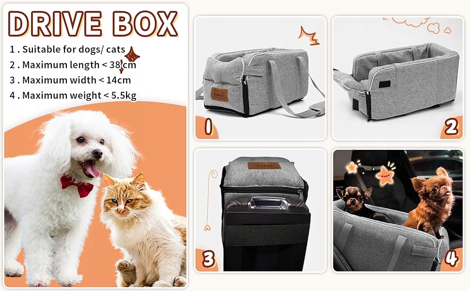 - Автокрісло для собак Yokee: 49*25*21 см (19,29*9,84*8,26 дюймів) і підходить для довжини центральної консолі? 12 дюймів, перед покупкою виміряйте довжину центральної консолі. Сидіння для собак підходить для більшості маленьких собак і кішок. Підходить для більшості типів транспортних засобів: АВТОМОБІЛІВ, позашляховиків, вантажівок.
