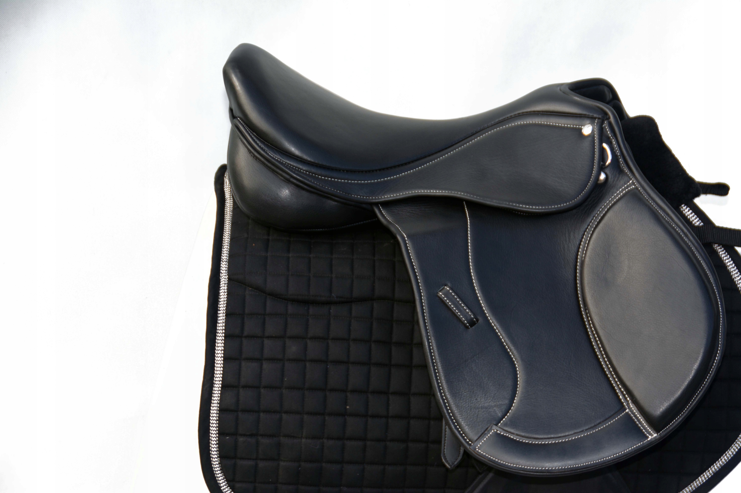 Сідло для стрибків розміром 17,5 дюймів – повністю виготовлене з дуже якісної, добірної м’якої волової шкіри. Виготовлено на шорно-сідельній фабриці у Франції. Сідло має легку конструкцію, дерево сконструйовано таким чином, що стегна і особливо тазостегнові суглоби не сприйнятливі до зайвого навантаження, оптимально розміщений центр дозволяє правильно посадити вершника. Колінний блок регулюється за допомогою липучок. Єдина модель сідла за такою низькою ціною.