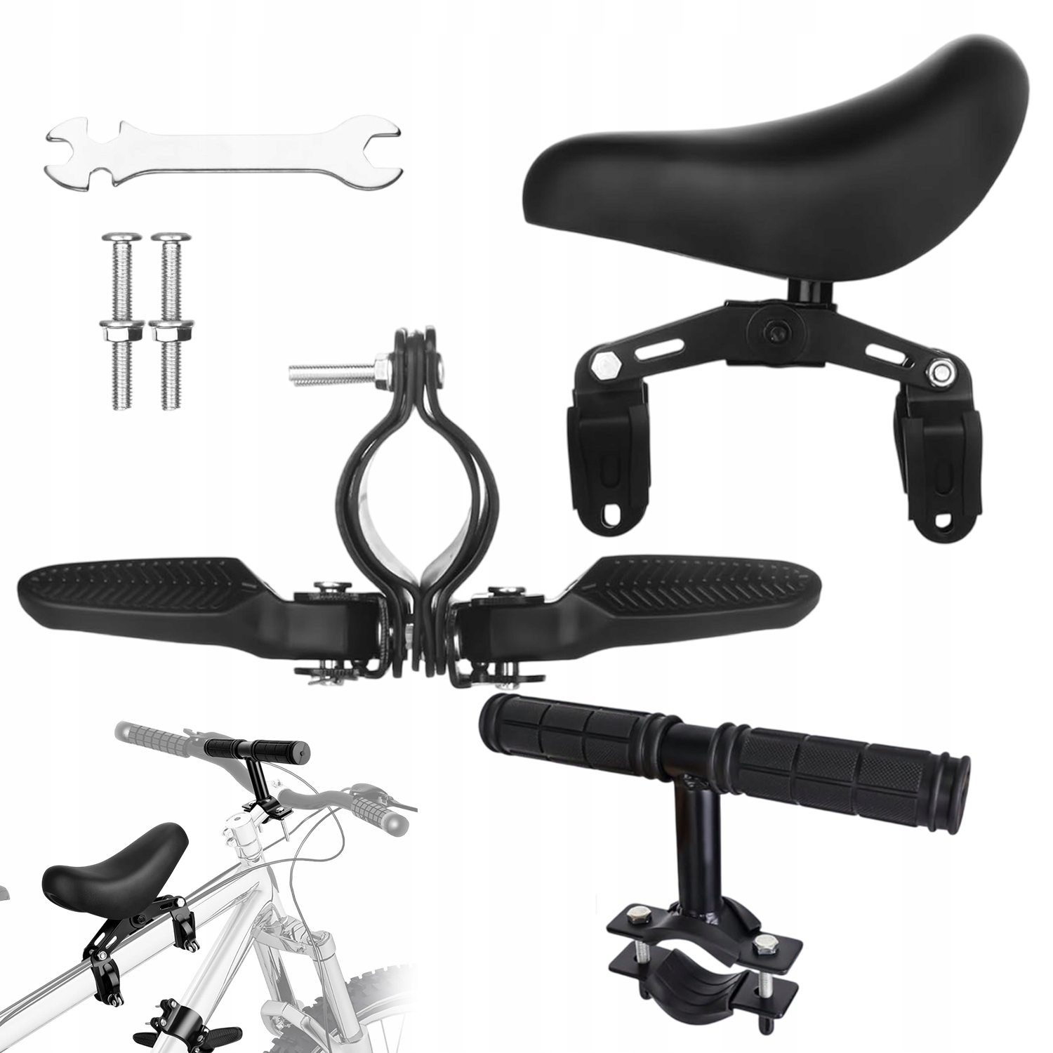 Переднє сидіння дитячого велосипеда оснащене регульованою подушкою та гумовим кермом, а також нековзкою складною підніжкою. Тримайте свою дитину в безпеці та комфорті. Він дуже підходить для інтерактивних подорожей і спортивних ігор з дітьми.