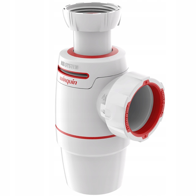Нагвинчується на різьбу 1 1/2". Забезпечує швидке, зручне, водонепроникне з’єднання на 1/4 оберту завдяки вбудованим ущільненням, виготовленим за технологією ін’єкцій. Додаткова функція AIR SYSTEM вирівнює негативний тиск у сифоні. Це запатентована інноваційна система аерації, яка усуває дратівливі шуми та неприємний запах, викликаний так званим сифонним ефектом, завдяки чому вода висмоктується з сифона природним шляхом завдяки відкриттю мембрани при кожному негативному тиску, що запобігає всмоктуванню води з сепаратора, робить його універсальним. Колір білий з червоними вставками.