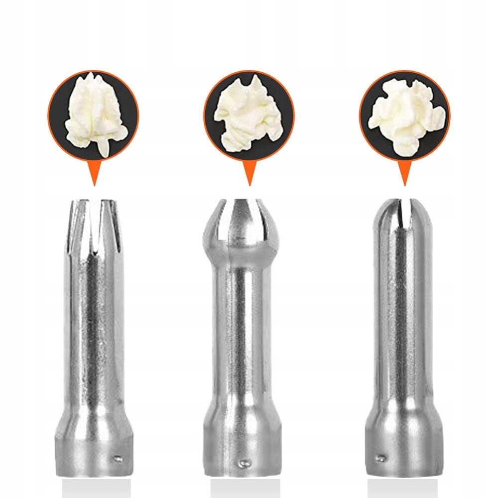 3 декоративні насадки з нержавіючої сталі. Різні дизайни десертів мають різні вимоги. Наш диспенсер для збитих вершків оснащений 3 декоративними насадками з нержавіючої сталі, щоб задовольнити всі ваші потреби щодо прикраси десертів.