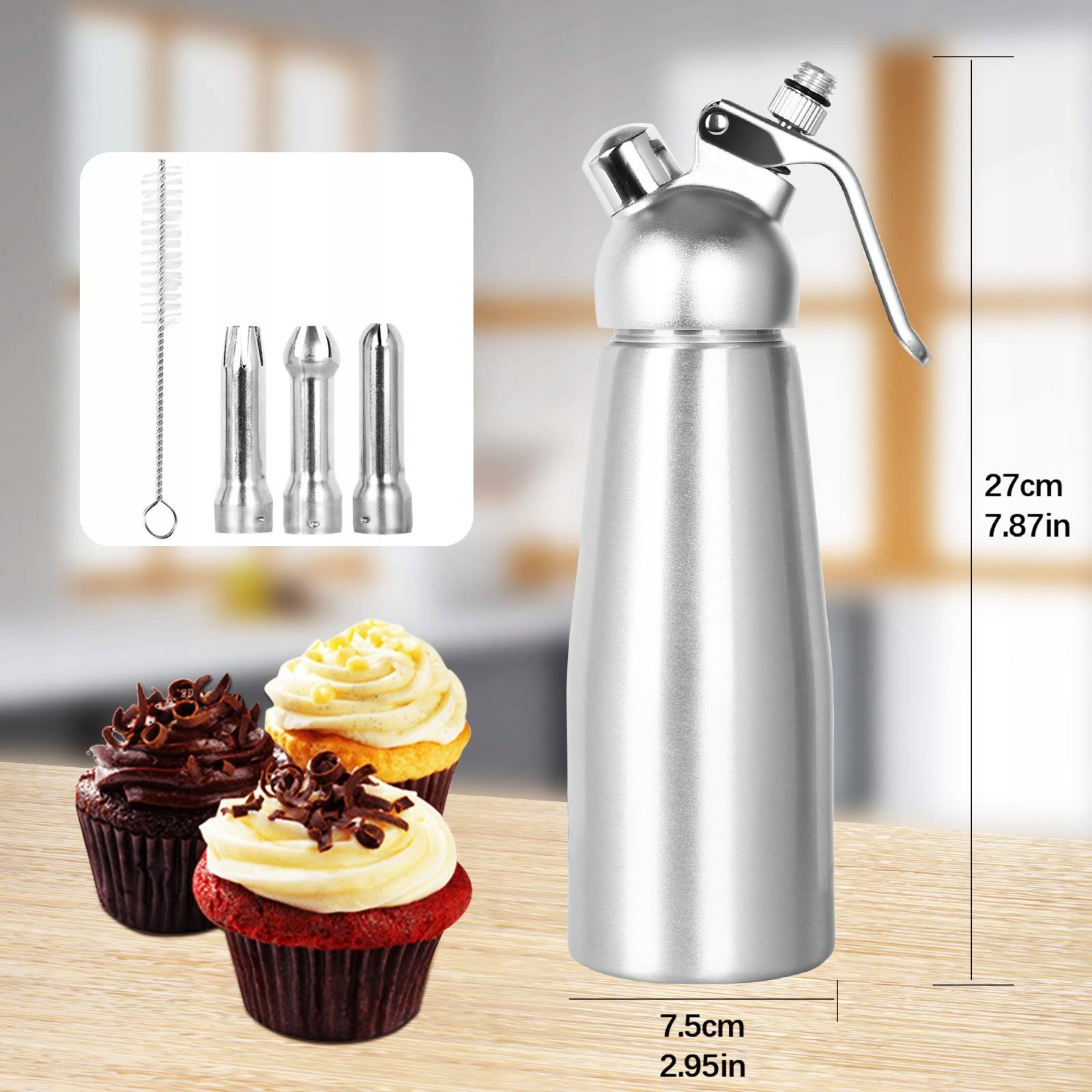 Алюмінієвий корпус: виготовлений із шліфованого алюмінію, безпечного для харчових продуктів, він абсолютно безпечний. Цей потужний дозатор для крему створений для тривалого використання, і ви можете покладатися на нього роками. У набір також входить щітка для легкого чищення менших частин.
