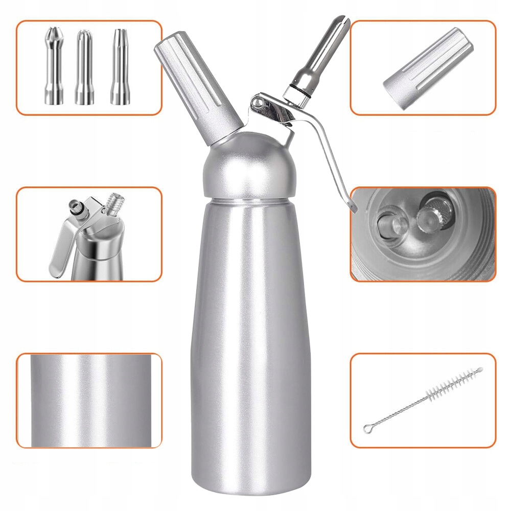 Алюмінієвий корпус: виготовлений із шліфованого алюмінію, безпечного для харчових продуктів, він абсолютно безпечний. Цей потужний дозатор для крему створений для тривалого використання, і ви можете покладатися на нього роками. У набір також входить щітка для легкого чищення менших частин.