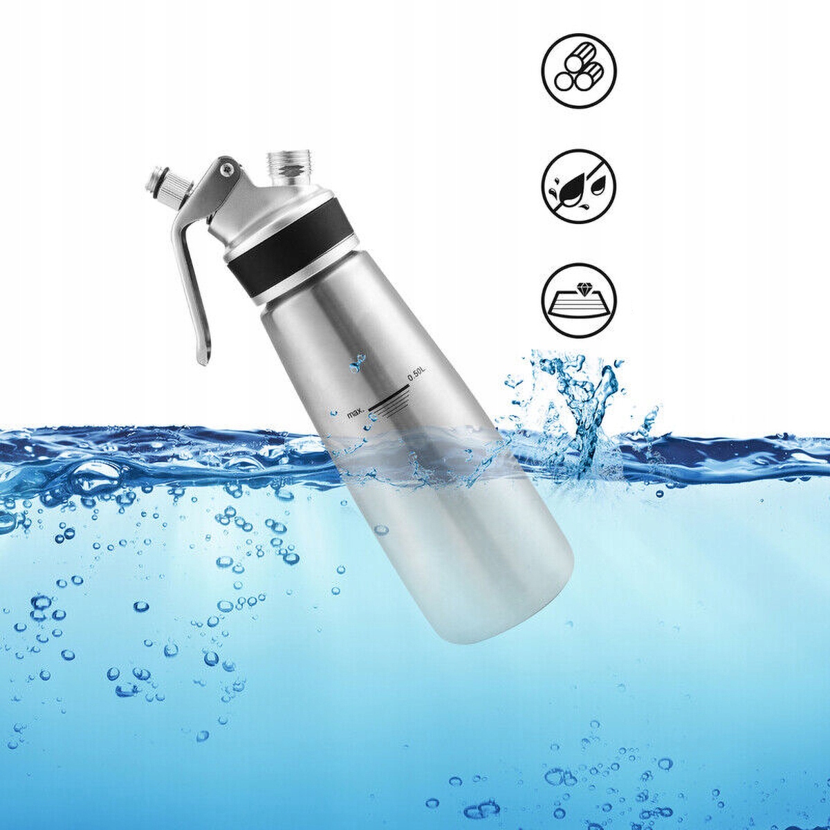 Найвища якість - спінювач для вершків виготовлено з високоякісного алюмінієвого сплаву та є міцним. Незалежне силіконове ущільнювальне кільце забезпечує герметичність і запобігає розтікання крему. Його можна легко зняти для очищення після використання. Конструкція протиковзкої головки забезпечує легку роботу.