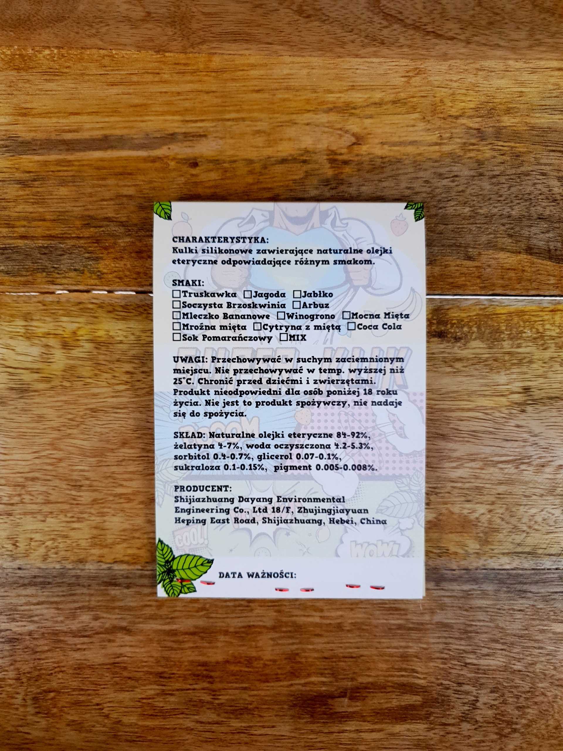 Продукт був ретельно відібраний серед багатьох виробників кульок, завдяки чому кульки «SUPER CLICK» містять ефірні масла найвищої якості, що надає їм неповторний, неповторний і тривалий смак.
