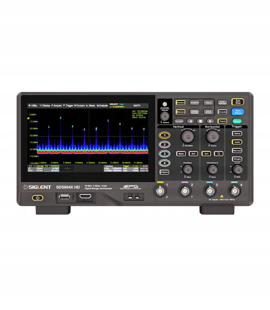 змішаний сигнал uscillococe (4 канали/70 м. Осцилоскопи високої роздільної здатності SDS800X HD базуються на 2 GSA/S, 12-бітних аналого-цифрових перетворювачі та передніх кінцях з відмінними показниками шумової підлоги. Вони доступні в пропускній здатності 70, 100 та 200 МГц, і відображають 2/4 аналогові канали разом із 16 цифровими каналами для аналізу змішаного сигналу (опція).
