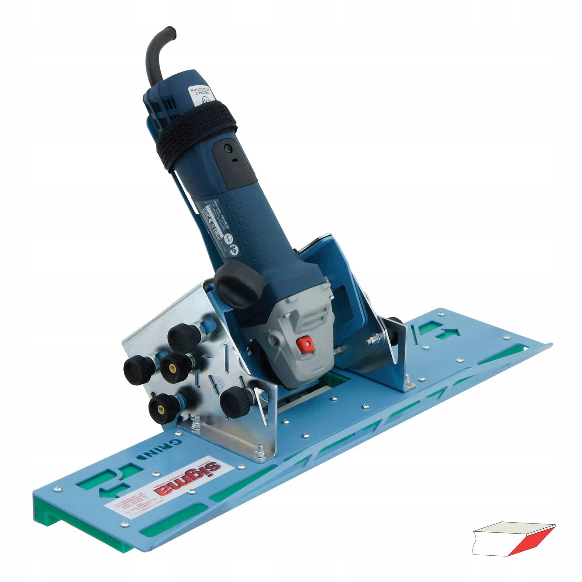 Пристрій профілювання SIGMA Edge JOLLY EDGE 37A3D (SIGMA-37A3D) Готовий для роботи з болгарками потужністю 700 - 1400W, Набір зі щитом арт. 75B, різьба М14, максимальний діаметр диска 125 мм, ПОПЕРЕДНЯ МОДЕЛЬ 37A2D ОПИС ПРОДУКТУ Він дозволяє зрізати ідеально рівний скіс по всій довжині оброблюваної кромки. Точне відтворення природної форми дошки. Досить одного розрізу. Пристрій можна використовувати для різання плитки товщиною 5 < 20 мм і довжиною краю від 30 см без обмежень. Пристрій з алмазним диском дозволяє різати під кутом від 40° до 50°. Прилад, оснащений алмазним шліфувальним кругом, дозволяє виконувати закруглення кромок (кут закруглення: 6 - 8 - 10 мм).