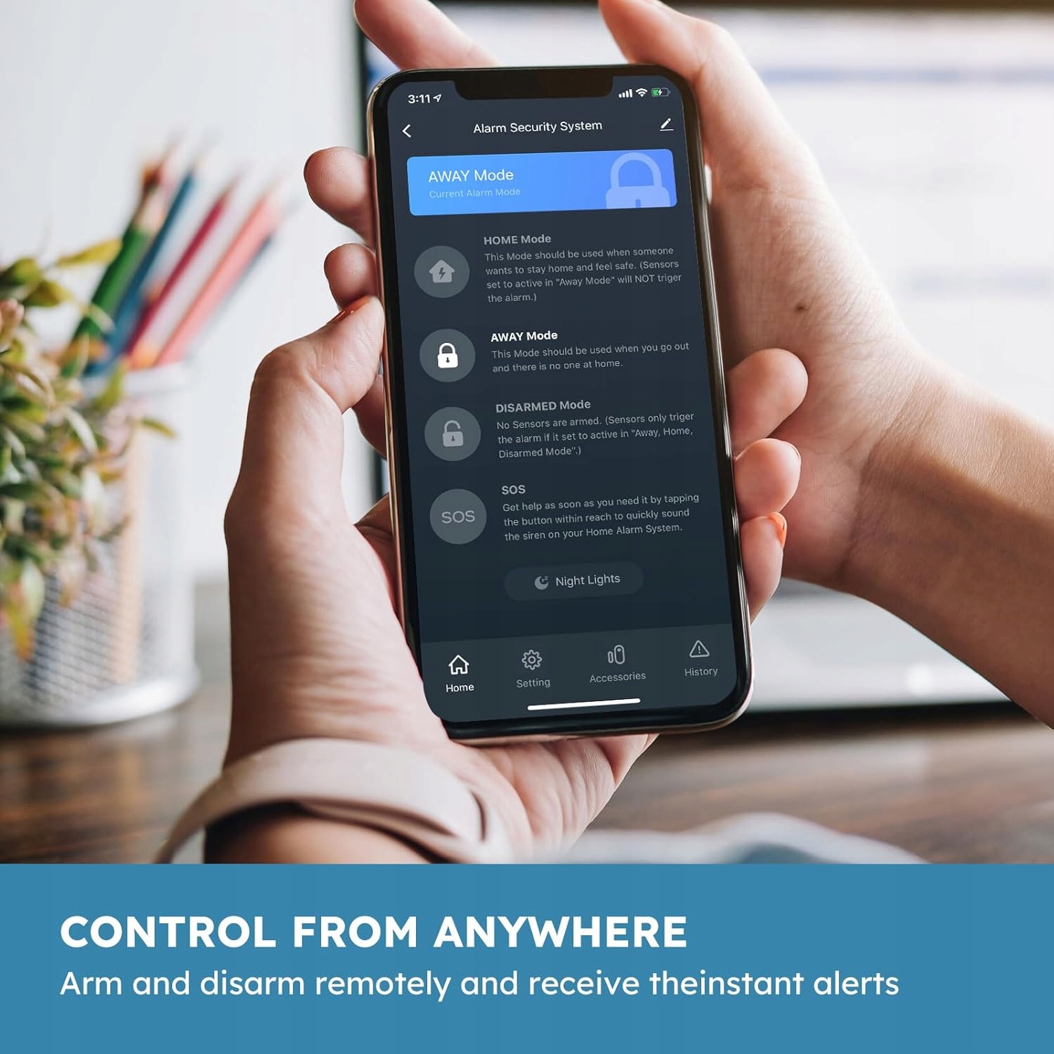 - Швидке та просте встановлення. Наш комплект сигналізації можна встановити за лічені хвилини без будь-яких попередніх технічних знань. Його можна підключити за допомогою шпильок, гвинтів і липких стрічок - всі ці пристрої входять в комплект поставки. Сучасний і скромний дизайн ідеально підійде до будь-якого інтер'єру.