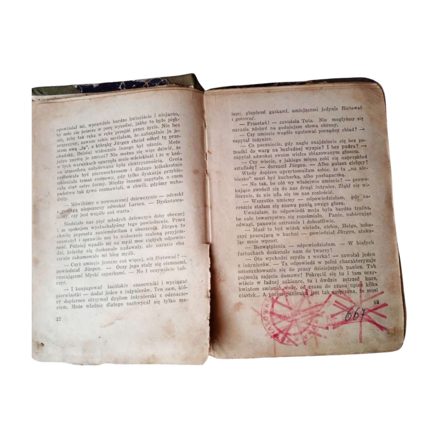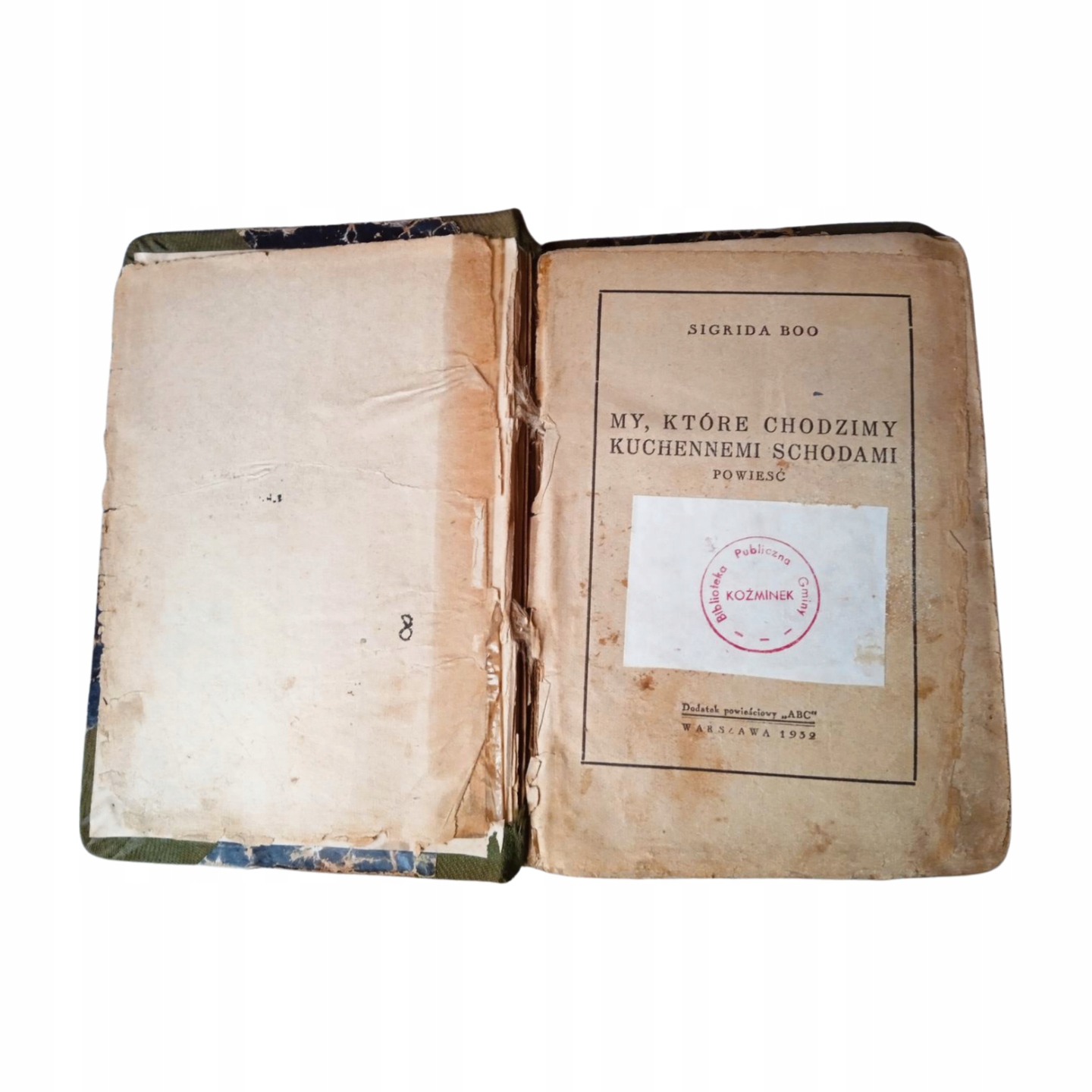 Продам книгу: Ми, що йдемо сходами на кухню. Автор: Сігріда Бу. Видавець: Drukarnia Literacka S.z.o.o. - Warszawa, Nowy Świat 22. Рік видання: 1932. Тверда палітурка, 235 сторінок. Досить хороший стан. Обкладинка забруднена, краї трохи потерті. Лицьова частина обкладинки, колись проклеєна скотчем, стирчить з книжкового блоку. Перші дві сторінки потерті по краях, з частковими дефектами країв. Книжковий блок відносно компактний. Сторінки пожовклі, деякі з них змінили колір або трохи забруднені. Кути сторінок закруглені. Кілька сторінок опущені, а їхні краї злегка потерті. На титульному аркуші та на останній сторінці є наліпка з печаткою міської бібліотеки часів Польської Народної Республіки.