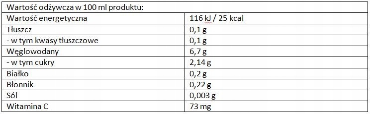 *RWS - контрольне значення споживання для середньої дорослої людини. Упаковка містить 6 рекомендованих порцій продукту. Індивідуальні потреби в окремих інгредієнтах можуть бути вищими або нижчими залежно від статі, віку, рівня фізичної активності та інших факторів. Заявлені на етикетці харчові цінності, смак, запах і колір соку можуть залежати від сорту і ступеня зрілості плодів. Осад на дні пляшки є природним явищем. Містить лише цукри, які є природними у фруктах.