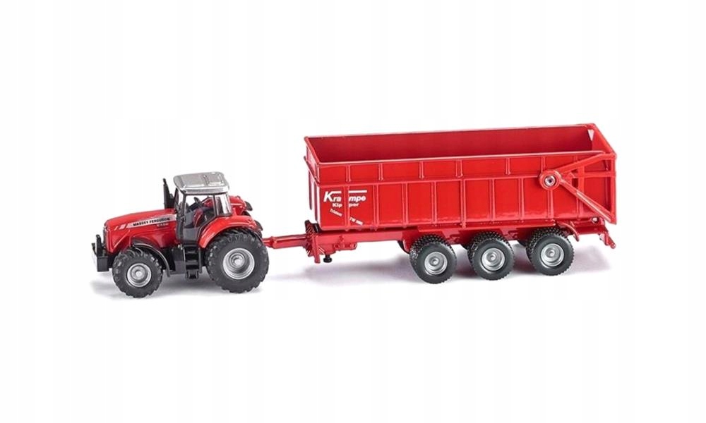 Висококласна модель трактора Massey Ferguson з розсувним причепом зі стабілізатором і знімною кабіною. Виготовлена з металевих і пластикових деталей, що зберігають деталі справжнього автомобіля, масштаб 1:87. Поворотні колеса і гумові шини дозволяють вільно пересуватися по різних поверхнях. Цікава пропозиція для шанувальників серії SIKU Farmer.