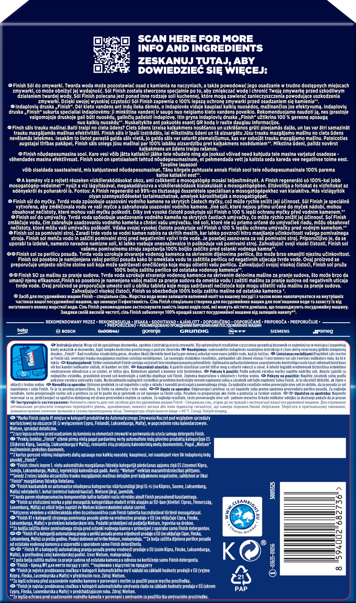 Захисна сіль для обробки посудомийної машини є важливим елементом для досягнення ідеальної чистоти ваших страв. Він не тільки захищає пристрій від кам'яних родовищ і усуває плями на суднах, але й пом’якшує воду та покращує посудомийну машину. Він досягає прихованих місць, наприклад МАЙСЬКА ТА Труба. Він підтримує ефект миючого засобу, щоб судна були ще чистішими та блискучою. Закінчичну сіль рекомендується провідними виробниками посудомийної машини.