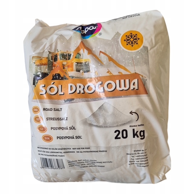 Дорожня сіль Stapar має промислове використання. Взимку стане в нагоді. Продукт ефективний і простий у використанні. Поставляється в щільній, але міцній сумці. Це полегшує зберігання та дозування.