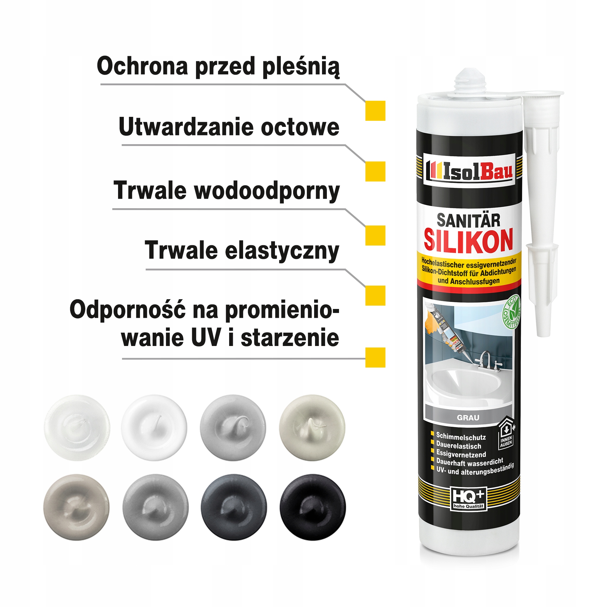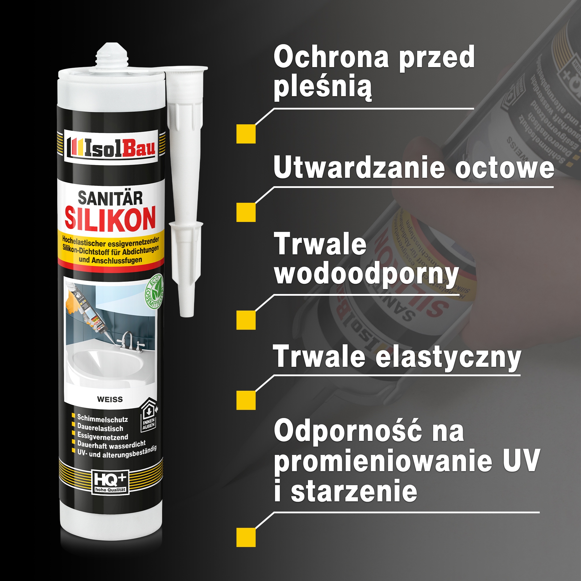 Один -Component, гнучка ущільнювальна маса з системою загартування оцту. Силікон характеризується підвищеною та довгим стійкістю до вологи, грибів, водоростей, цвілі, жирів, кислот та лугу. Це демонструє дуже хорошу адгезію до скла, теракоти, кераміки та захищених металів. Ущільнювач є довговічним, повністю стійким до змінних умов та УФ -променів.